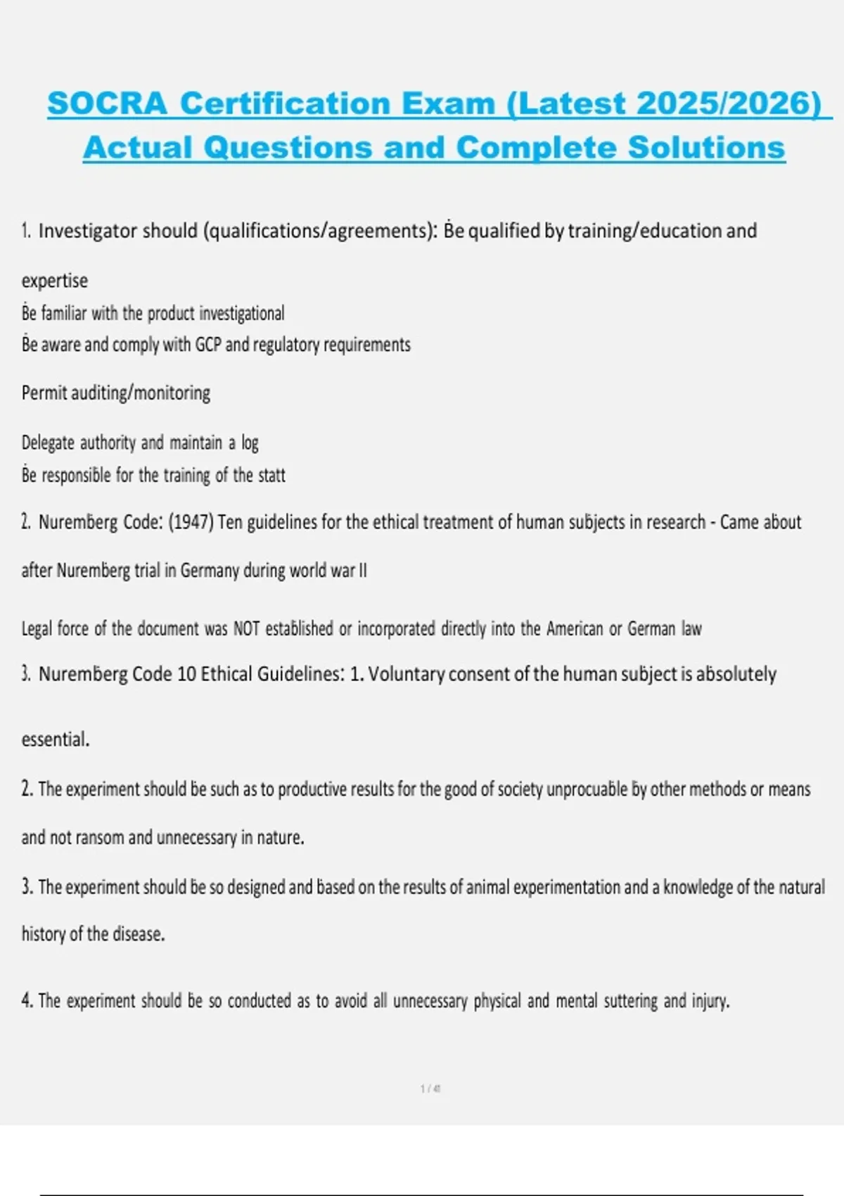 This document provides actual questions and complete solutions for the SOCRA (Society of Clinical Research Associates) certification exam, updated for the 2025/2026 cycle. It covers key areas including clinical research practices, regulatory compliance, and ethical standards. With accurate and detailed solutions, this resource serves as a comprehensive study guide to ensure effective exam preparation and certification success.