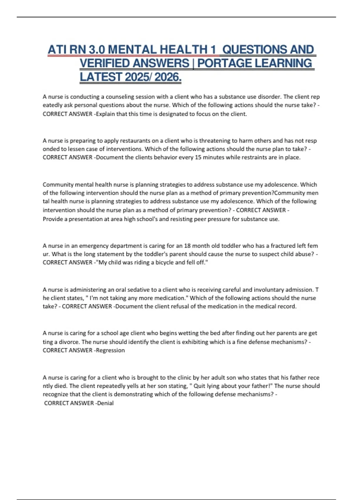 ATI RN 3.0 MENTAL HEALTH 1 QUESTIONS AND VERIFIED ANSWERS | PORTAGE LEARNING LATEST 2025/ 2026.