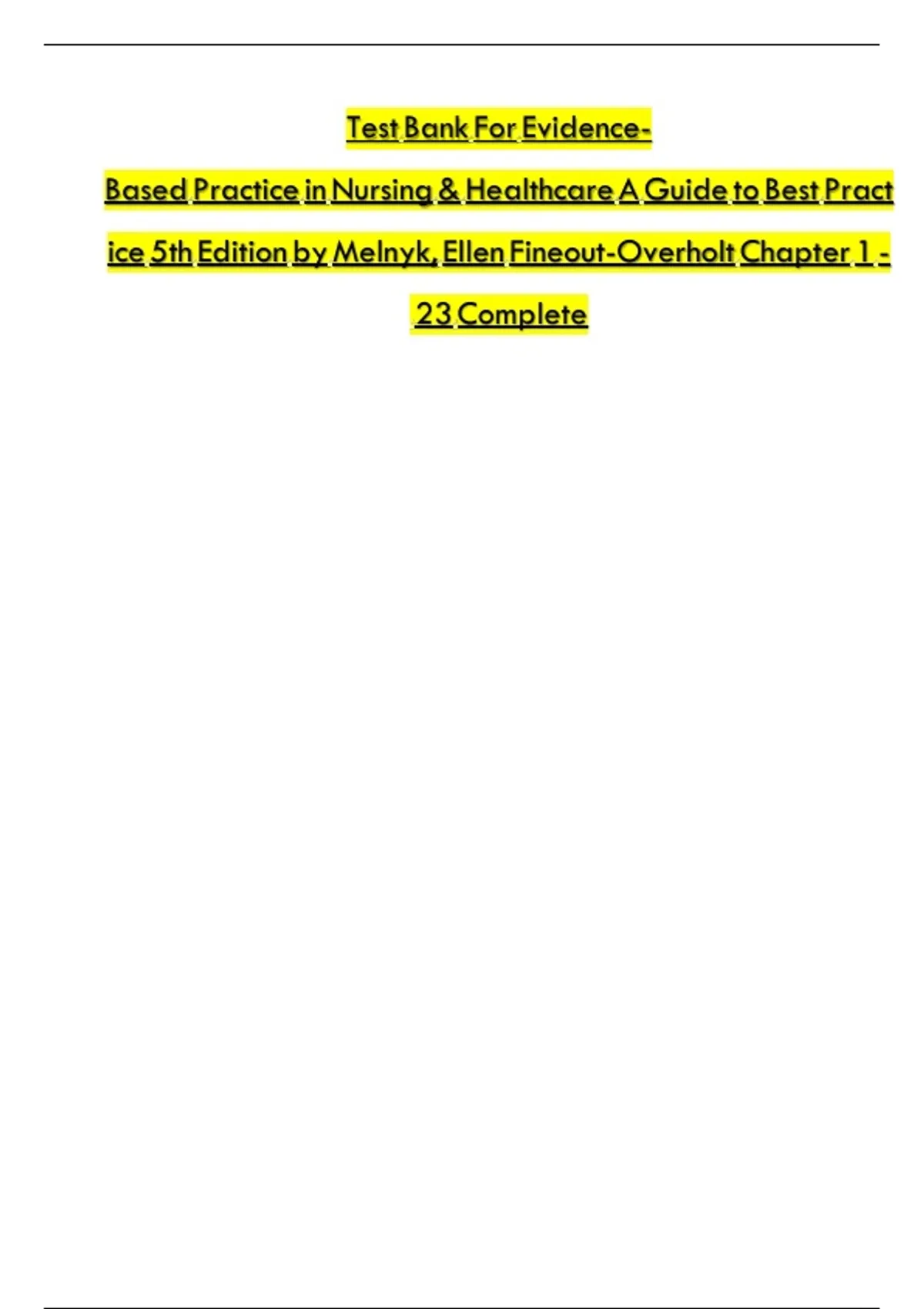 This document includes a full set of exam questions and correct answers from Chapters 1 through 5 of Evidence-Based Practice in Nursing & Healthcare: A Guide to Best Practice (5th Edition) by Melnyk and Fineout-Overholt. Each chapter features multiple-choice questions with rationales that test understanding of key concepts such as PICOT questions, critical appraisal, levels of evidence, and research utilization. Ideal for nursing students, educators, and professionals preparing for EBP-related exams or coursework.