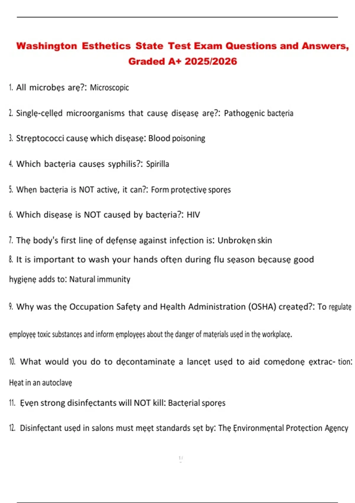 This document provides Washington State esthetics state test exam questions with correct answers, graded A+, for the 2025/2026 exam cycle. It covers all required topics, including skin care, sanitation, safety, and professional practice standards. The material is fully updated to reflect current state board requirements, making it a dependable and accurate study resource.