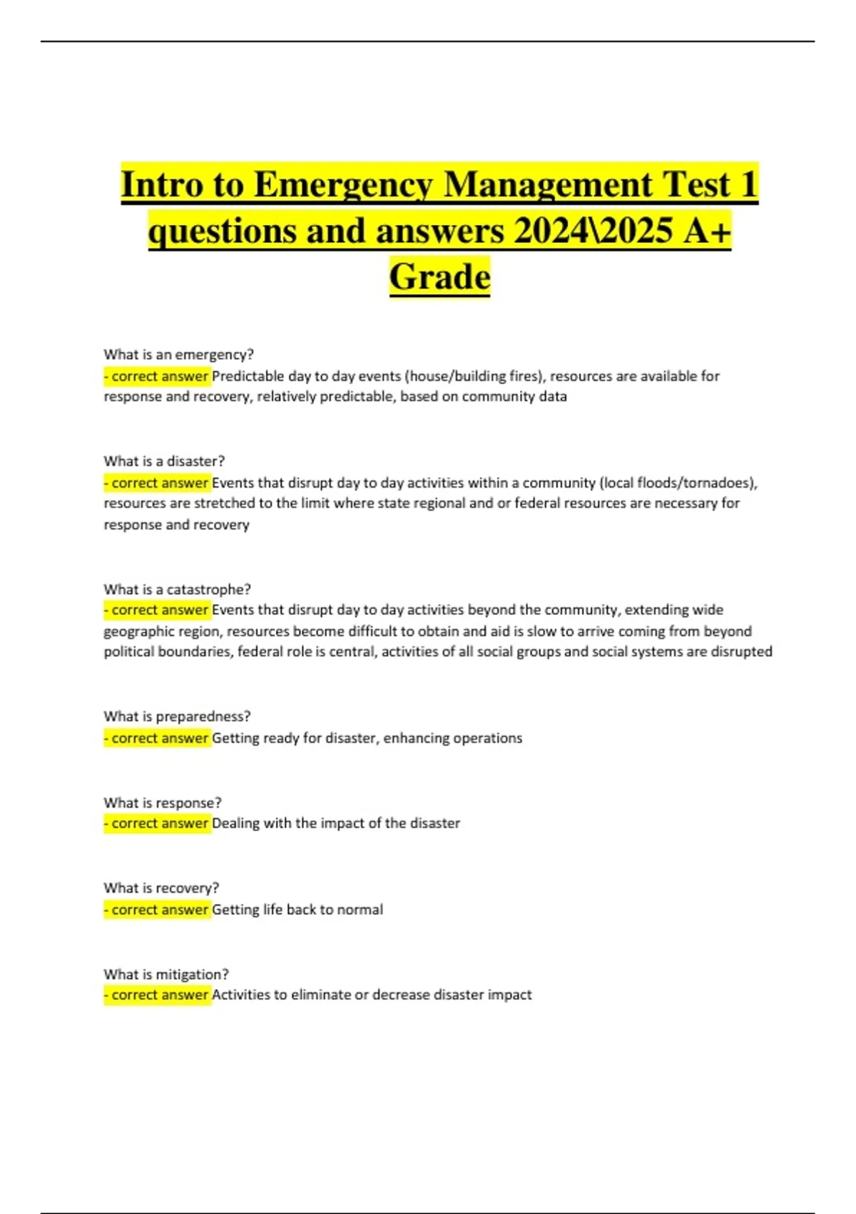 Introduction to Emergency Management Test 1 Exam Questions and Answers | 100% Correct Verified Solutions | A+ Grade 2024/2025: This document provides the Test 1 exam for Introduction to Emergency Management with 100% correct and verified answers for the 2024/2025 academic year. It covers foundational topics including disaster preparedness, mitigation, response, recovery, emergency planning, and coordination across agencies. Verified for accuracy and graded A+, this resource ensures strong preparation and exam success.