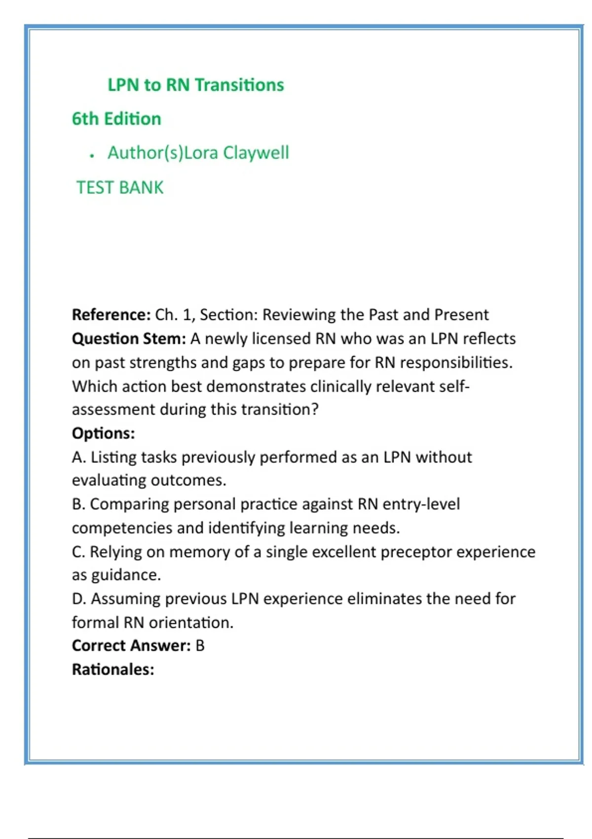 Complete Test Bank for LPN to RN Transitions (6th Ed.) — 20 NCLEX/HESI-Style MCQs per Chapter | Lora Claywell–Aligned Exam Prep 2. SEO Description (150–200 words) This complete test bank for LPN to RN Transitions (6th Edition) by Lora Claywell delivers comprehensive, evidence-based exam preparation tailored for LPN→RN bridge students and nurse educators. Each chapter includes 20 NCLEX/HESI-style multiple-choice questions with correct answers and step-by-step verified rationales that mirror textbook concepts, professional role transition objectives, and RN entry-level competencies. Built to support classroom assessment, self-study, and certification readiness, the test bank emphasizes clinical judgment, leadership, delegation, ethical/legal decision-making, and critical thinking — the high-value skills evaluators expect. Educators will appreciate alignment with Claywell’s chapter objectives for seamless syllabus integration; students gain focused practice to consolidate learning and increase confidence in high-stakes testing. Reliable, academically rigorous, and classroom-ready, this resource is ideal for LPN–RN bridge programs, review courses, and individual NCLEX/HESI preparation. Trustworthy, well-referenced, and clearly organized for quick deployment in study plans and instructional materials. 3. 10 Hashtags (for social & educational platforms) #LPNtoRN #NCLEXPrep #HESI #NursingStudents #NurseEducator #TestBank #LPNTransition #BridgeProgram #NursingExamPrep #EvidenceBasedNursing 4. Keywords (15–20 high-value SEO phrases) LPN to RN test bank LPN to RN Transitions test bank Claywell test bank NCLEX practice questions HESI practice questions LPN to RN bridge exam prep nursing test bank with rationales NCLEX-style MCQs for LPNs HESI-style MCQs for RN transition evidence-based nursing questions professional role transition nursing questions nursing education resources RN entry-level competency practice critical thinking nursing questions delegation and leadership nursing items nursing exam rationales and explanations classroom assessment for LPN→RN programs LPN RN study guide questions clinical judgment practice questions test bank for nursing instructors