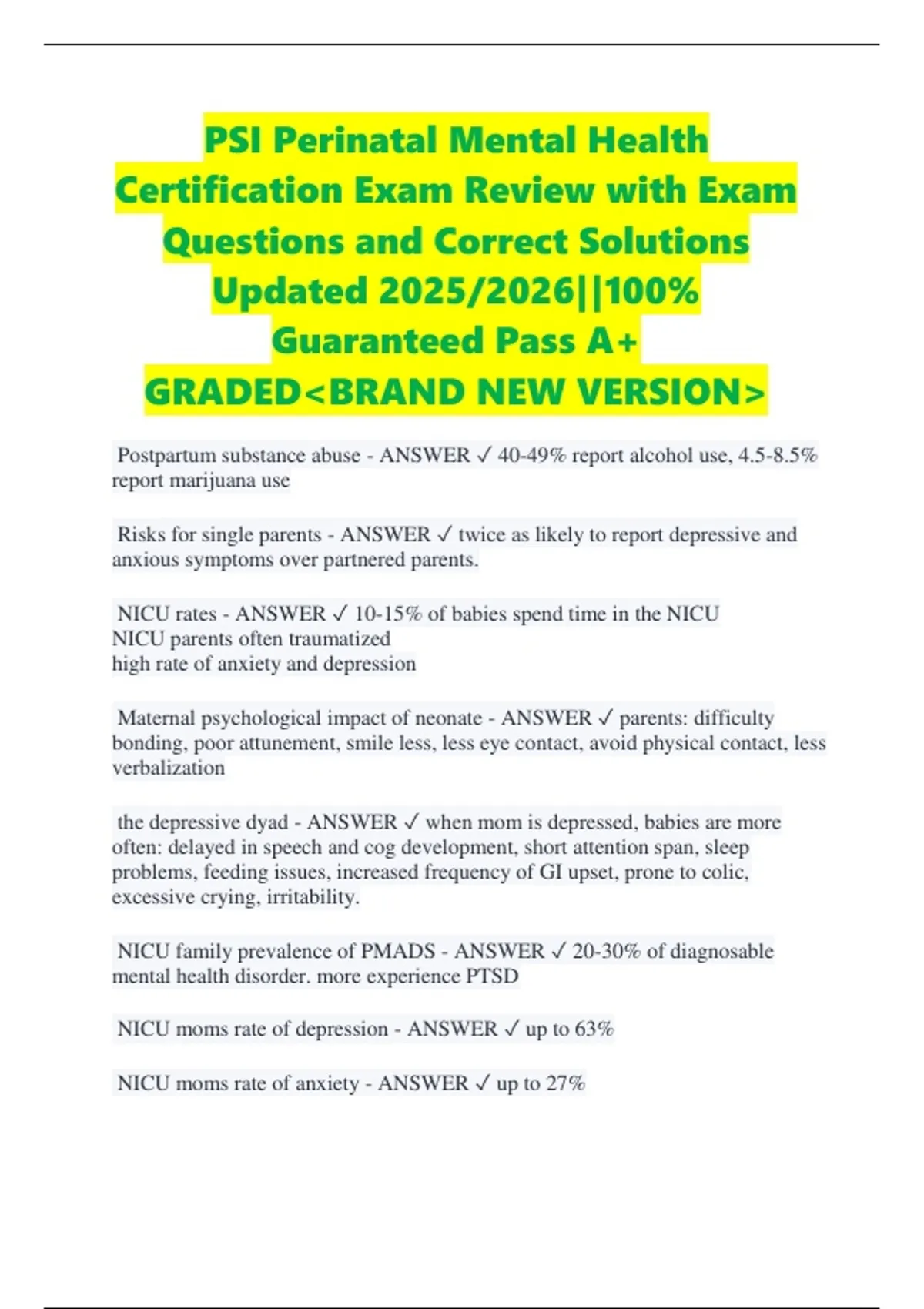 PSI Perinatal Mental Health Certification Exam Review with Exam Questions and Correct Solutions Updated 2025/2026||100% Guaranteed Pass A+ GRADEDBRAND NEW VERSION