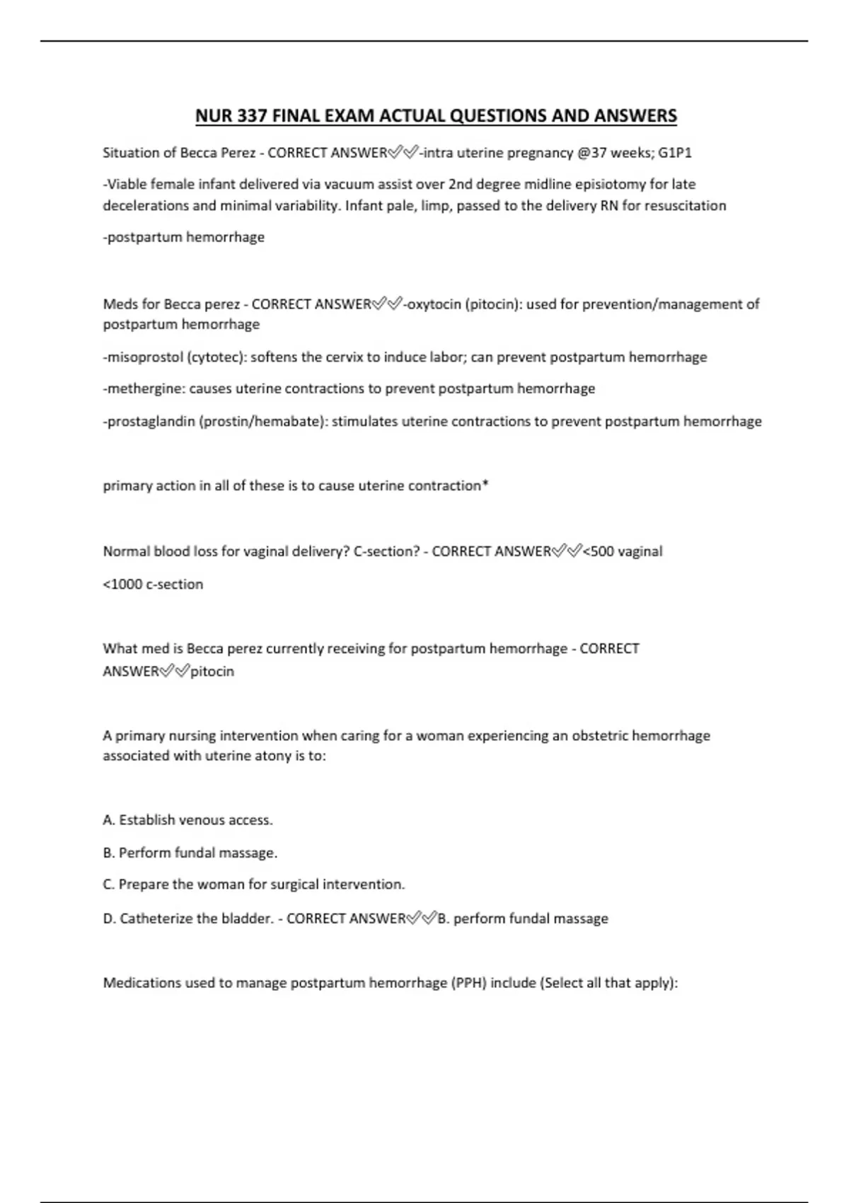 NUR 337 FINAL EXAM ACTUAL QUESTIONS AND ANSWERS Situation of Becca Perez - CORRECT ANSWER-intra uterine pregnancy @37 weeks; G1P1 -Viable female infant delivered via vacuum assist over 2nd degree midline episiotomy for late decelerations and minimal variability. Infant pale, limp, passed to the delivery RN for resuscitation -postpartum hemorrhage
