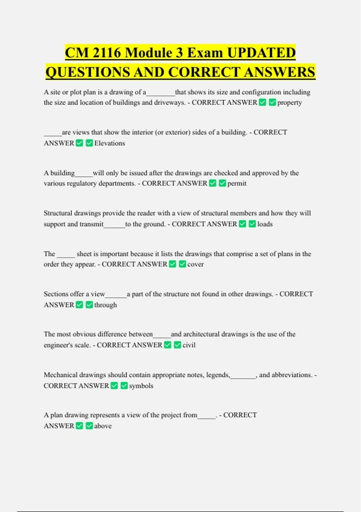 CM 2116 Module 3 Exam UPDATED QUESTIONS AND CORRECT ANSWERS A site or plot plan is a drawing of a________that shows its size and configuration including the size and location of buildings and driveways. - CORRECT ANSWER property _____are views that show the interior (or exterior) sides of a building. - CORRECT ANSWER Elevations A building_____will only be issued after the drawings are checked and approved by the various regulatory departments. - CORRECT ANSWER permit Structural drawings provide the reader with a view of structural members and how they will support and transmit______to the ground. - CORRECT ANSWER loads