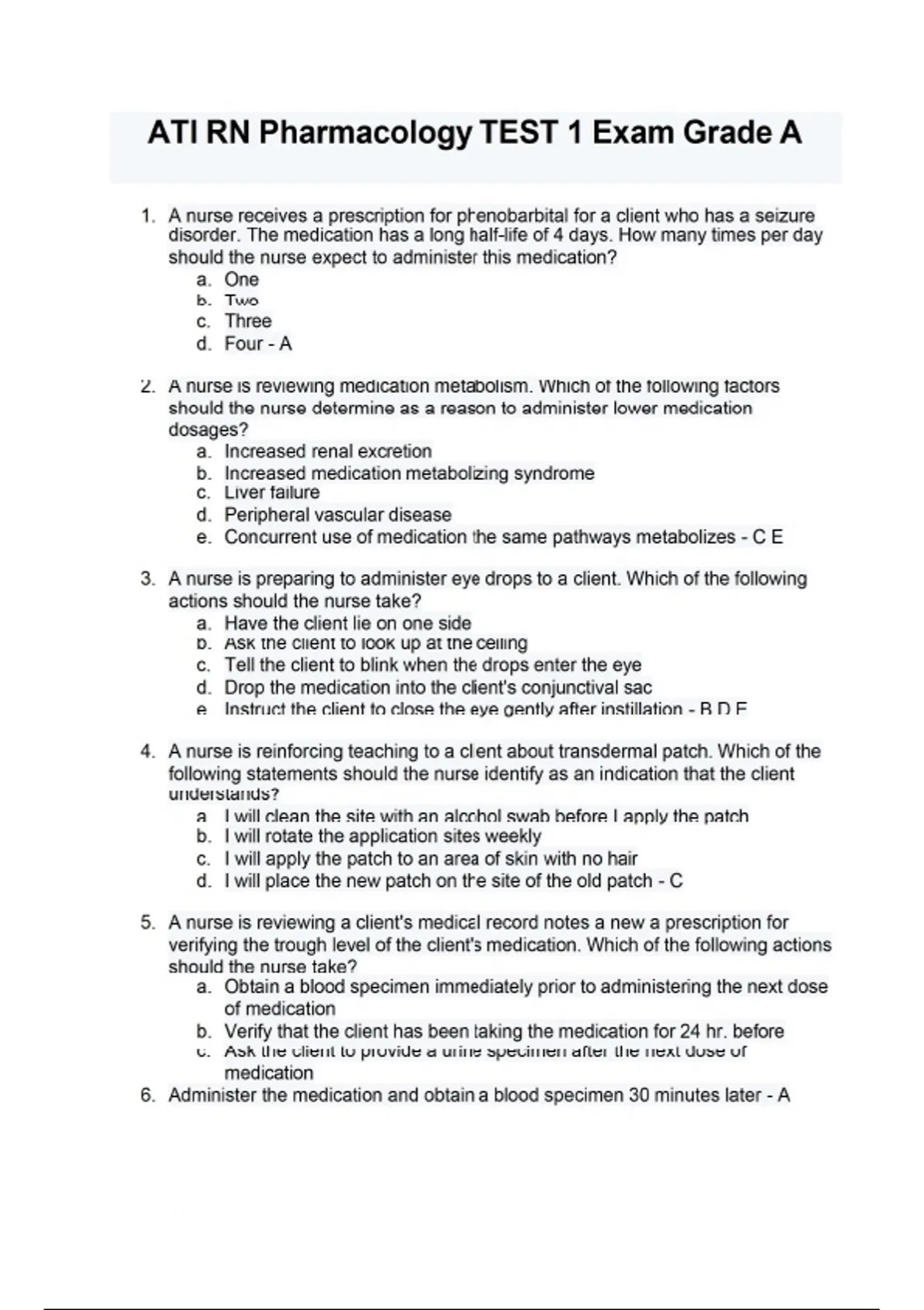 1. A nurse receives a prescription for phenobarbital for a client who has a seizure disorder. The medication has a long half-life of 4 days. How many times per day should the nurse expect to administer this medication? a. One b. Two c. Three d. Four - A 2. A nurse is reviewing medication metabolism. Which of the following factors should the nurse determine as a reason to administer lower medication dosages? a. Increased renal excretion b. Increased medication metabolizing syndrome c. Liver failure d. Peripheral vascular disease e. Concurrent use of medication the same pathways metabolizes - C E 3. A nurse is preparing to administer eye drops to a client. Which of the following actions should the nurse take? a. Have the client lie on one side b. Ask the client to look up at the ceiling c. Tell the client to blink when the drops enter the eye d. Drop the medication into the client's conjunctival sac e. Instruct the client to close the eye gently after instillation - B D E 4. A nurse is reinforcing teaching to a client about transdermal patch. Which of the following statements should the nurse identify as an indication that the client understands? a. I will clean the site with an alcohol swab before I apply the patch b. I will rotate the application sites weekly c. I will apply the patch to an area of skin with no hair d. I will place the new patch on the site of the old patch - C 5. A nurse is reviewing a client's medical record notes a new a prescription for verifying the trough level of the client's medication. Which of the following actions should the nurse take? a. Obtain a blood specimen immediately prior to administering the next dose of medication b. Verify that the client has been taking the medication for 24 hr. before c. Ask the client to provide a urine specimen after the next dose of medication Administer the medication and obtain a blood specimen 30 minutes later - A