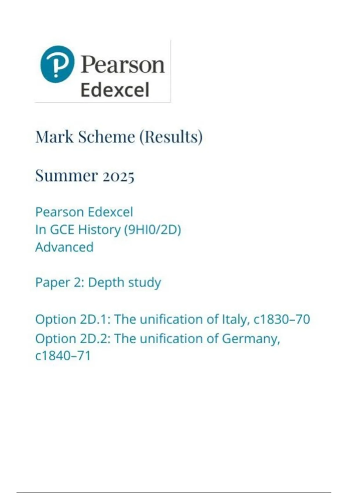 Pearson Edexcel In GCE History (9HI0/2D) Advanced Paper 2: Depth study Option 2D.1: The unification of Italy, c1830-70 Option 2D.2: The unification of Germany, c1840-71 mark scheme June 2025