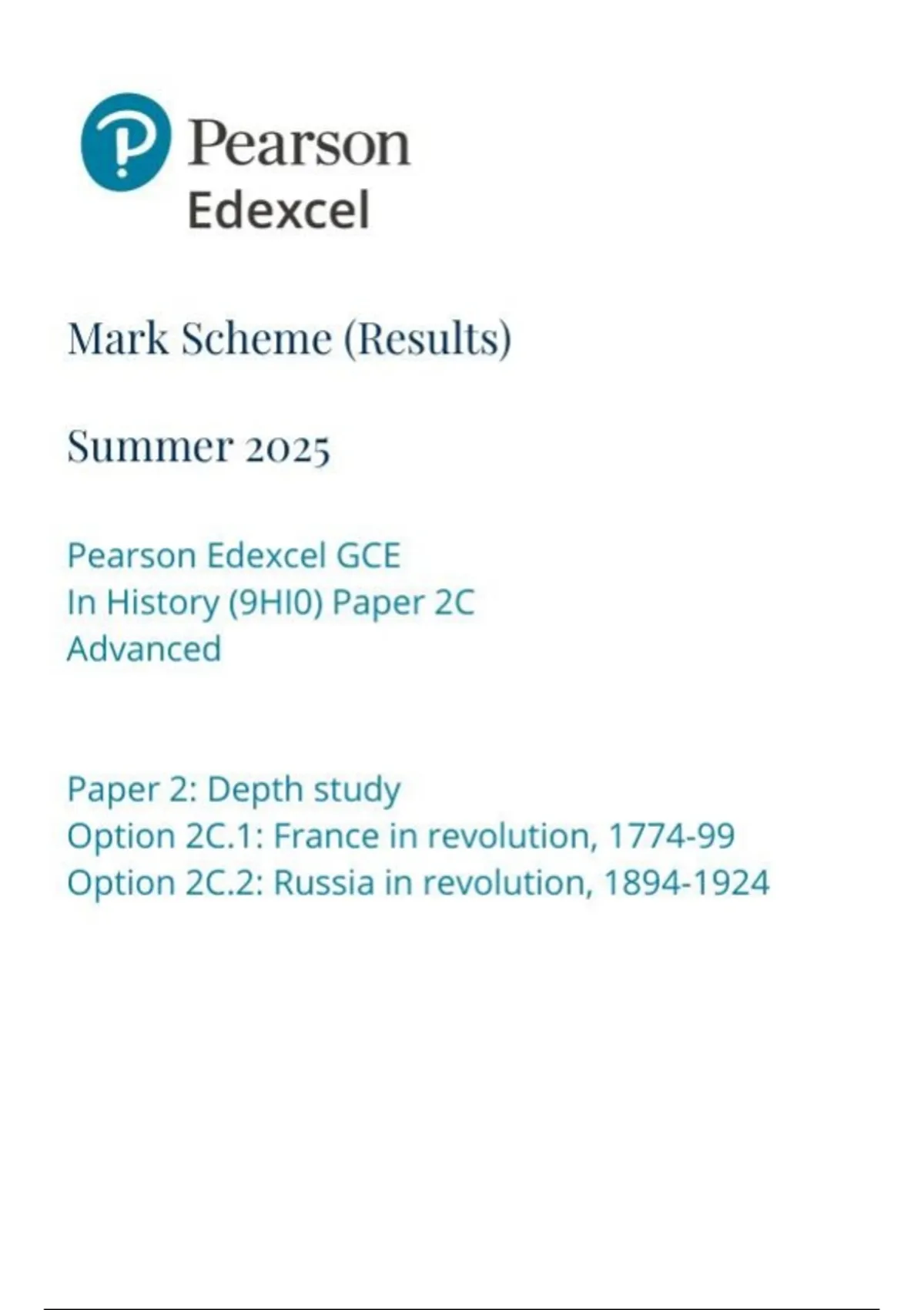 Pearson Edexcel GCE In History (9HIO) Paper 2C Advanced Paper 2: Depth study Option 2C.1: France in revolution, 1774-99 Option 2C.2: Russia in revolution, mark scheme June 2025