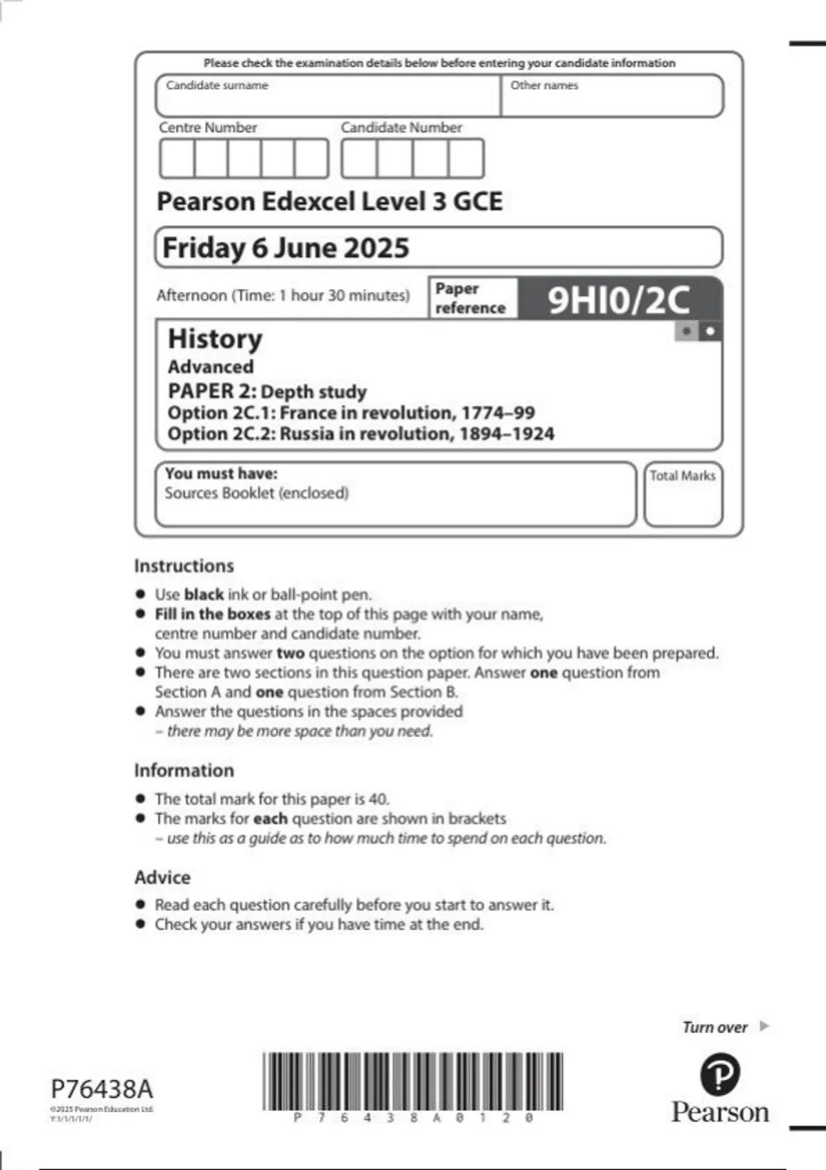 Pearson Edexcel Level 3 GCE History Advanced PAPER 2: Depth study Option 2C.1: France in revolution, 1774-99 Option 2C.2: Russia in revolution, HI0/2C question paper June 2025