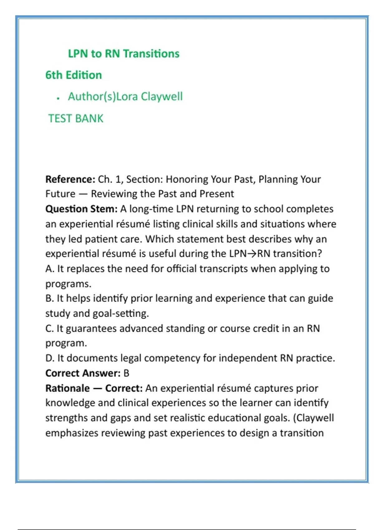 LPN to RN Transitions Test Bank — 20 NCLEX/HESI-Style MCQs per Chapter | Claywell 6th Ed. | LPN→RN Bridge Exam Prep & Verified Rationales 2. SEO Description (150–200 words) This authoritative test bank delivers complete, textbook-aligned exam preparation for LPN to RN Transitions (6th Ed.) by Lora Claywell. Designed specifically for LPN→RN bridge students, nurse educators, and program directors, the resource offers 20 evidence-based NCLEX/HESI-style multiple-choice questions per chapter with single-best-answer format, correct answers, and step-by-step verified rationales. Every item is crafted to mirror curriculum expectations—clinical judgment, role transition, delegation, legal/ethical decision-making, and leadership—so learners build confidence and competence for licensure and workplace practice. Emphasizing accuracy, reliability, and pedagogical alignment with Claywell’s chapter objectives, this test bank supports formative assessment, high-stakes review, and remediation plans. Use it for classroom quizzes, standardized practice exams, or self-study to accelerate professional growth and seamless role transition. Ideal for NCLEX and HESI preparation, course integration, and certification readiness, the collection saves faculty time while elevating student outcomes through measurable, curriculum-mapped practice. 3. Hashtags (10) #LPNtoRN #NursingStudents #NCLEXPrep #HESIPrep #NursingEducation #BridgeProgram #NurseEducator #ClinicalJudgment #ProfessionalTransition #NursingExamPrep 4. Keywords / Phrases (15–20) LPN to RN test bank LPN→RN bridge exam questions NCLEX practice questions LPN to RN HESI style nursing questions Claywell LPN to RN test bank 20 MCQs per chapter test bank Evidence-based nursing questions Single best answer rationales Nursing role transition questions Delegation and scope of practice MCQs Legal and ethical nursing questions Nursing curriculum aligned test bank RN licensure exam prep resources Bridge program exam materials Faculty ready nursing test bank Clinical judgment practice questions Continuing education assessment items Verified step-by-step rationales
