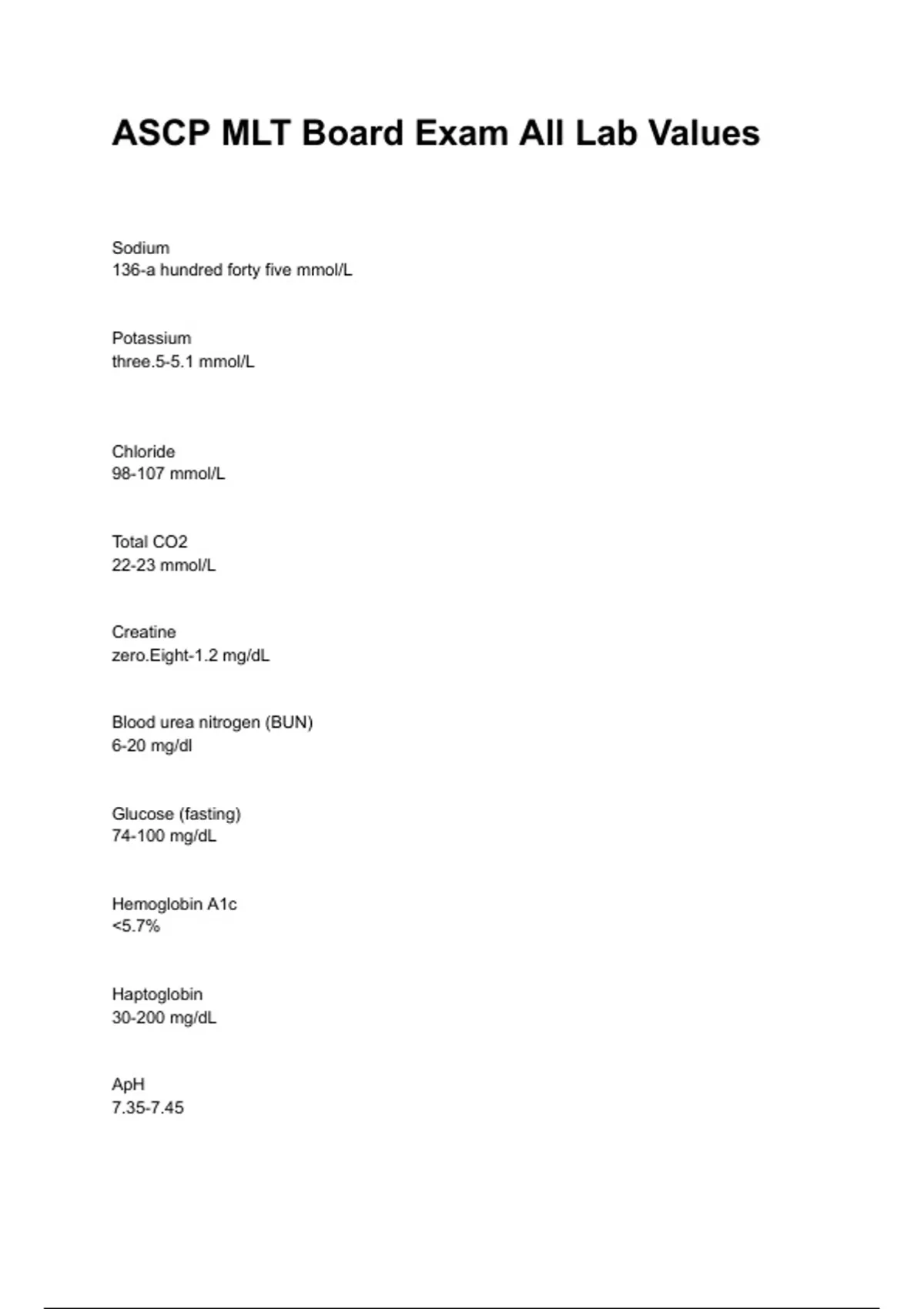 ASCP MLT Board Exam All Lab Values NEWEST 2025/2026 ACTUAL EXAM COMPLETE QUESTIONS AND CORRECT DETAILED ANSWERS (VERIFIED ANSWERS) |ALREADY GRADED A+||BRAND NEW!!