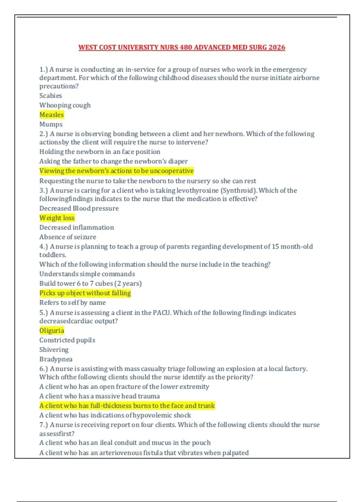 Updated exams .Actual tests 100% verified.ATI,NURSING,PMHNP,TNCC,USMLE,ACLS,WGU AND ALL EXAMS guaranteed success.Here, you will find everything you need in NURSING EXAMS AND TESTBANKS.Contact us, to fetch it for you in minutes if we do not have it in this shop.BUY WITHOUT DOUBT!!!!Always leave a review after purchasing any document so as to make sure our customers are 100% satisfied. **Ace Your Exams with Confidence!**