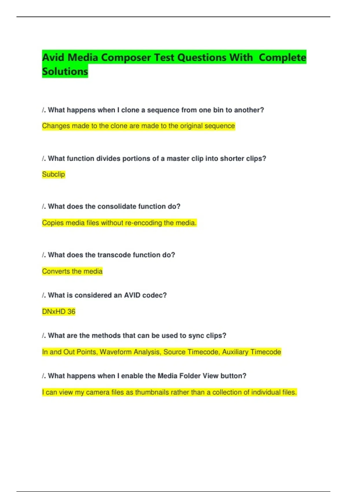 Avid Media Composer Test Questions With Complete Solutions /. What happens when I clone a sequence from one bin to another? Changes made to the clone are made to the original sequence /. What function divides portions of a master clip into shorter clips? Subclip /. What does the consolidate function do? Copies media files without re-encoding the media. /. What does the transcode function do? Converts the media /. What is considered an AVID codec? DNxHD 36 /. What are the methods that can be used to sync clips? In and Out Points, Waveform Analysis, Source Timecode, Auxiliary Timecode /. What happens when I enable the Media Folder View button? I can view my camera files as thumbnails rather than a collection of individual files. /. True or False: When creating a new project, raster dimensions in Media Composer are limited to the options listed in the Format drop-down menu. False /. What are camera natives? The original audio and video files created by the camera that are played back in real time using AMA plugins. /. What is the fastest way to apply a Timecode Burn-In to a stringent sequence? Add the timecode burn-in effect to the filler track above the sequence. /. True or False: Using Top or Tail to remove footage from the timeline leaves a gap. False /. What are the common uses for markers? - Provide correct spelling for titles - Marking the location of good sound bites - Leaving notes for the producer, colorist, or audio mixer /.Which method should I use in the Command Palette if I want to use it as an editing tool? Active Palette /. What happens if I don't use marks in my timeline? The blue position indicator will serve as my in point in the timeline . /. True or False: Media Composer allows you to load a sequence into the Source monitor. True