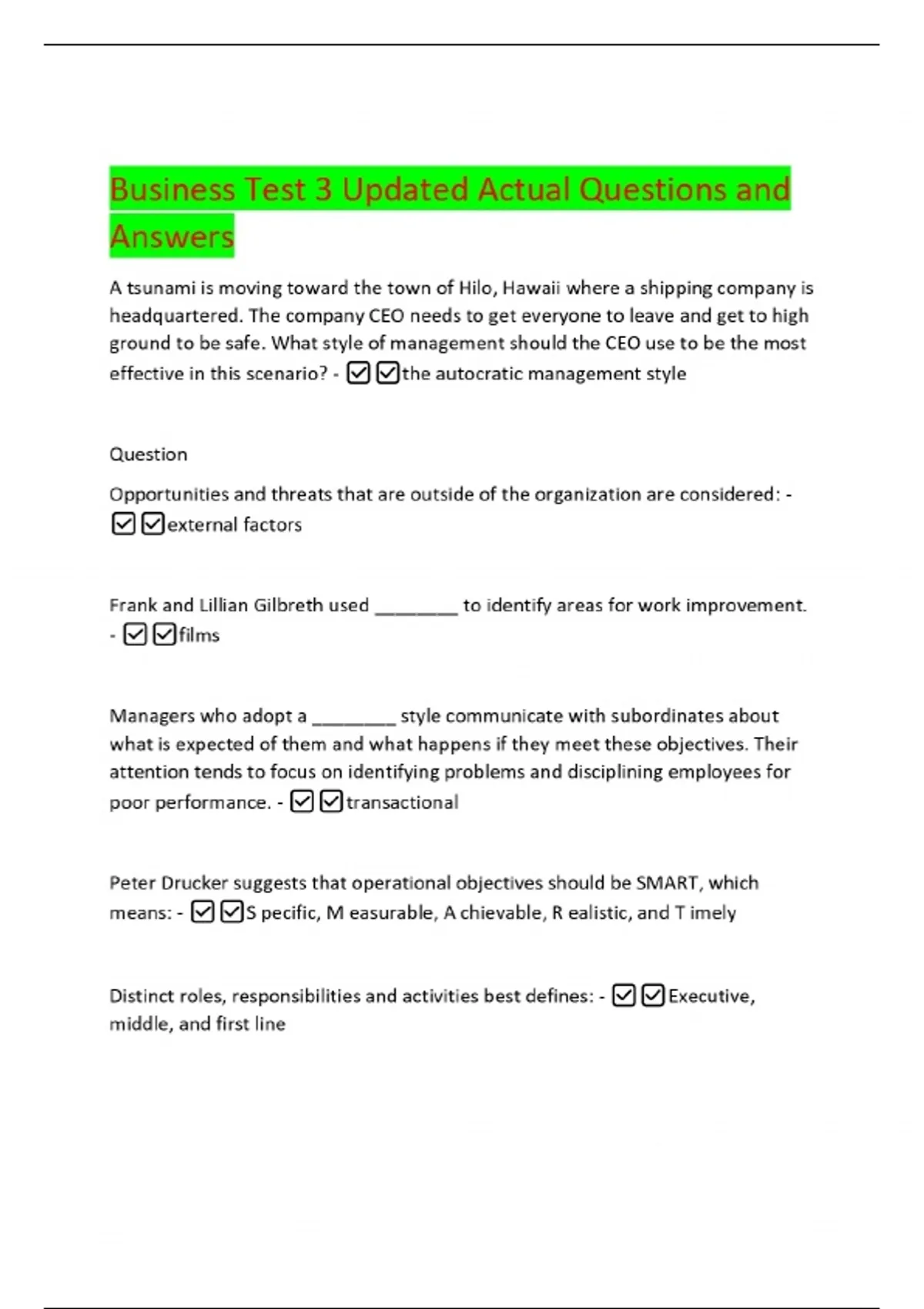 Business Test 3 Updated Actual Questions and Answers A tsunami is moving toward the town of Hilo, Hawaii where a shipping company is headquartered. The company CEO needs to get everyone to leave and get to high ground to be safe. What style of management should the CEO use to be the most effective in this scenario? - the autocratic management style Question Opportunities and threats that are outside of the organization are considered: - external factors