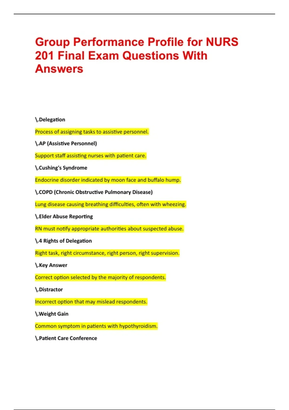 Group Performance Profile for NURS 201 Final Exam Questions With Answers .Delegation Process of assigning tasks to assistive personnel. .AP (Assistive Personnel) Support staff assisting nurses with patient care. .Cushing's Syndrome Endocrine disorder indicated by moon face and buffalo hump. .COPD (Chronic Obstructive Pulmonary Disease) Lung disease causing breathing difficulties, often with wheezing. .Elder Abuse Reporting RN must notify appropriate authorities about suspected abuse. .4 Rights of Delegation Right task, right circumstance, right person, right supervision. .Key Answer Correct option selected by the majority of respondents. .Distractor Incorrect option that may mislead respondents. .Weight Gain Common symptom in patients with hypothyroidism. .Patient Care Conference Meeting to discuss care strategies for patients and families. .Educator Role of the instructor in guiding nursing students. .Multiple Choice Question format with several answer options to choose from. .Question Analysis Evaluation of responses to assess understanding of material. .Moon Face Facial swelling associated with Cushing's syndrome. .Buffalo Hump Fat deposition on the upper back in Cushing's syndrome. .Clubbing Finger deformity often seen in chronic respiratory diseases. .Bronchodilator Medication used to relieve bronchospasm in COPD patients. .Incentive Spirometry Device to encourage deep breathing and lung expansion. .ALS Amyotrophic lateral sclerosis, a progressive neurodegenerative disease. .Counseling Guidance provided to family about ALS management. .Financial Burden Costs associated with ALS treatment and insurance. .Socialization Opportunities Facilitated interactions for families affected by ALS. .Guillain-Barre Syndrome Autoimmune disorder causing rapid muscle weakness. .Angina Pectoris Chest pain due to reduced blood flow to heart. .Anginal Pain Duration Typically lasts longer than 20 minutes. .Pain Relief Position Sitting up can alleviate anginal pain. .Peritonitis Inflammation of the peritoneum, often requiring urgent care. .Pancreatic Cancer Complications Potential issues arising from pancreatic cancer. .Hepatocellular Carcinoma Liver cancer originating in liver cells. .Liver Cancer Metastasis Tumors can spread from other organs to liver. .Hepatoblastoma Liver cancer occurring in children under 14. .Intrahepatic Cholangiocarcinoma Cancer of bile ducts within the liver. .Angiosarcoma Rare cancer starting in blood vessels of liver. .Thrombocytopenia Low platelet count, often seen in leukemia. .Testicular Self-Examination Procedure for men to check for testicular abnormalities. .Opioid Adverse Effects Side effects include constipation and sedation. .Orthostatic Hypotension