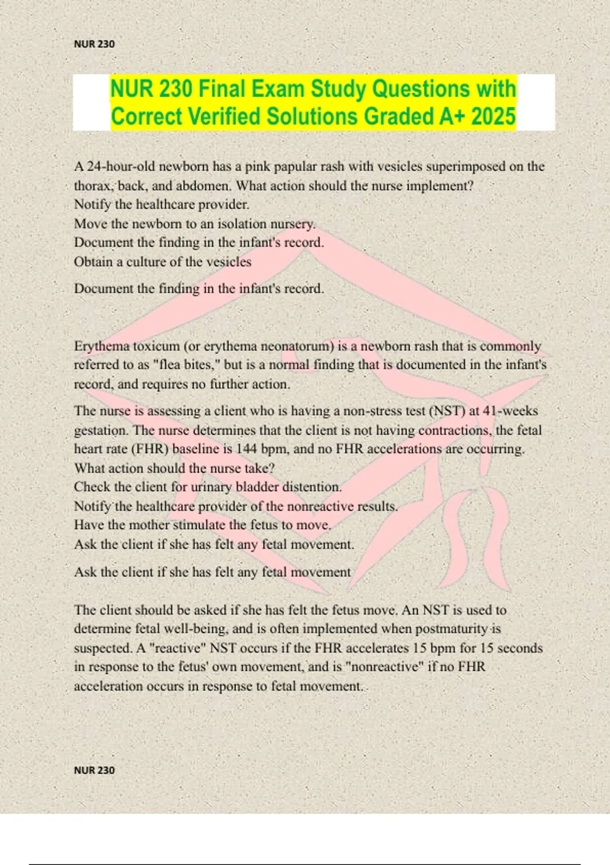 NUR 230 Final Exam Study Questions with
