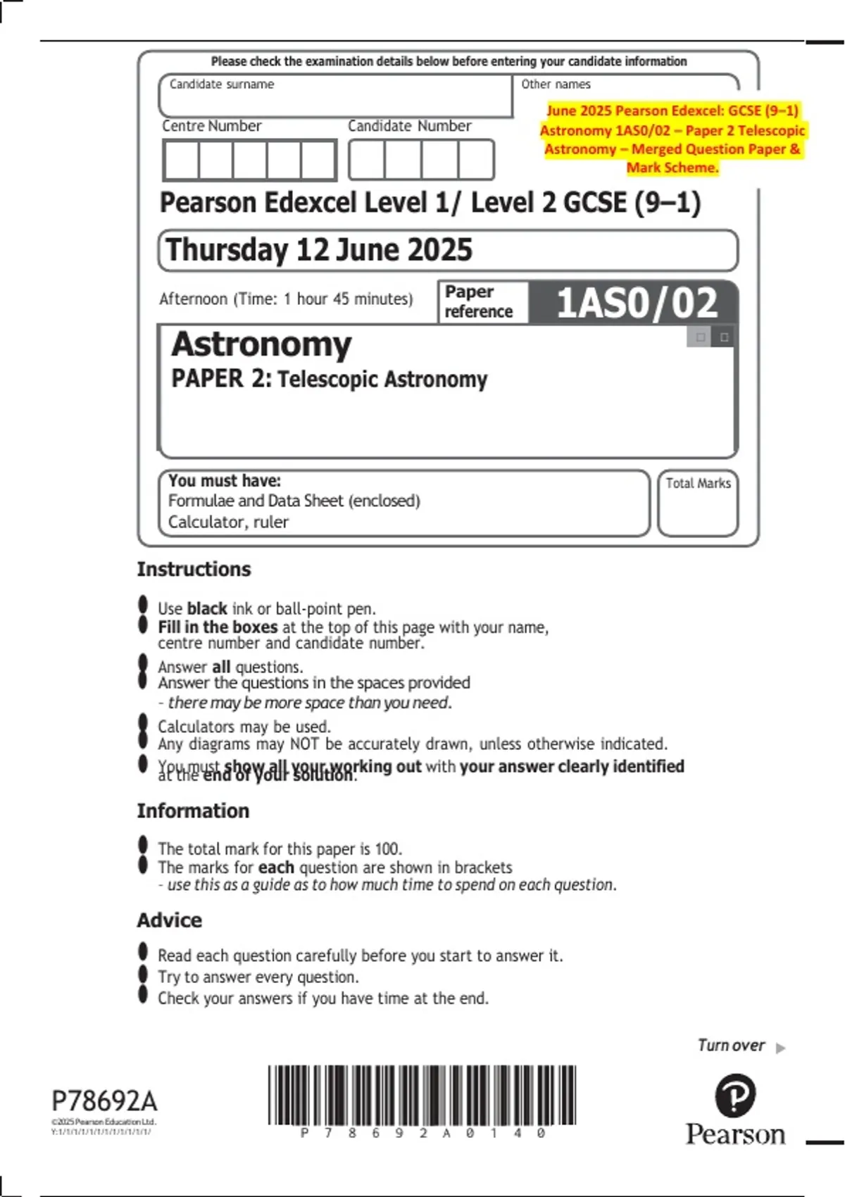 June 2025 Pearson Edexcel: GCSE (9–1) Astronomy 1AS0/02 – Paper 2 Telescopic Astronomy – Merged Question Paper & Mark Scheme.