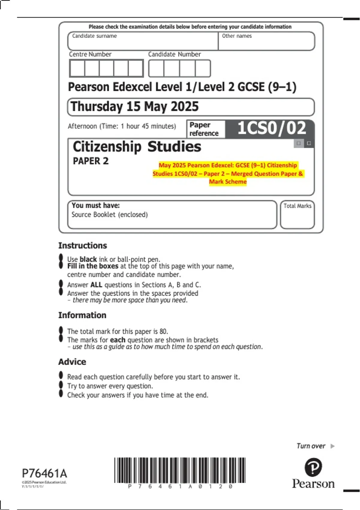 PAPER 2 May 2025 Pearson Edexcel: GCSE (9–1) Citizenship