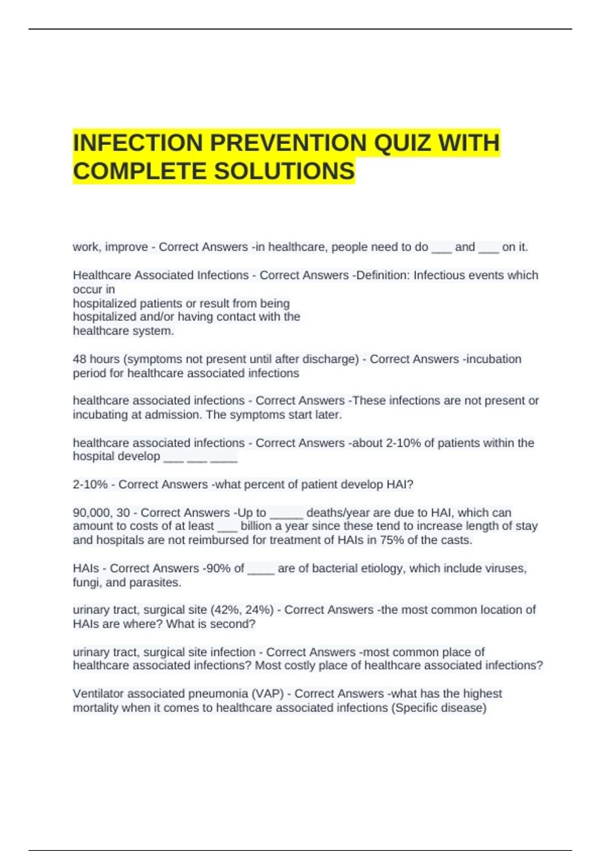 INFECTION PREVENTION QUIZ WITH COMPLETE SOLUTIONS
