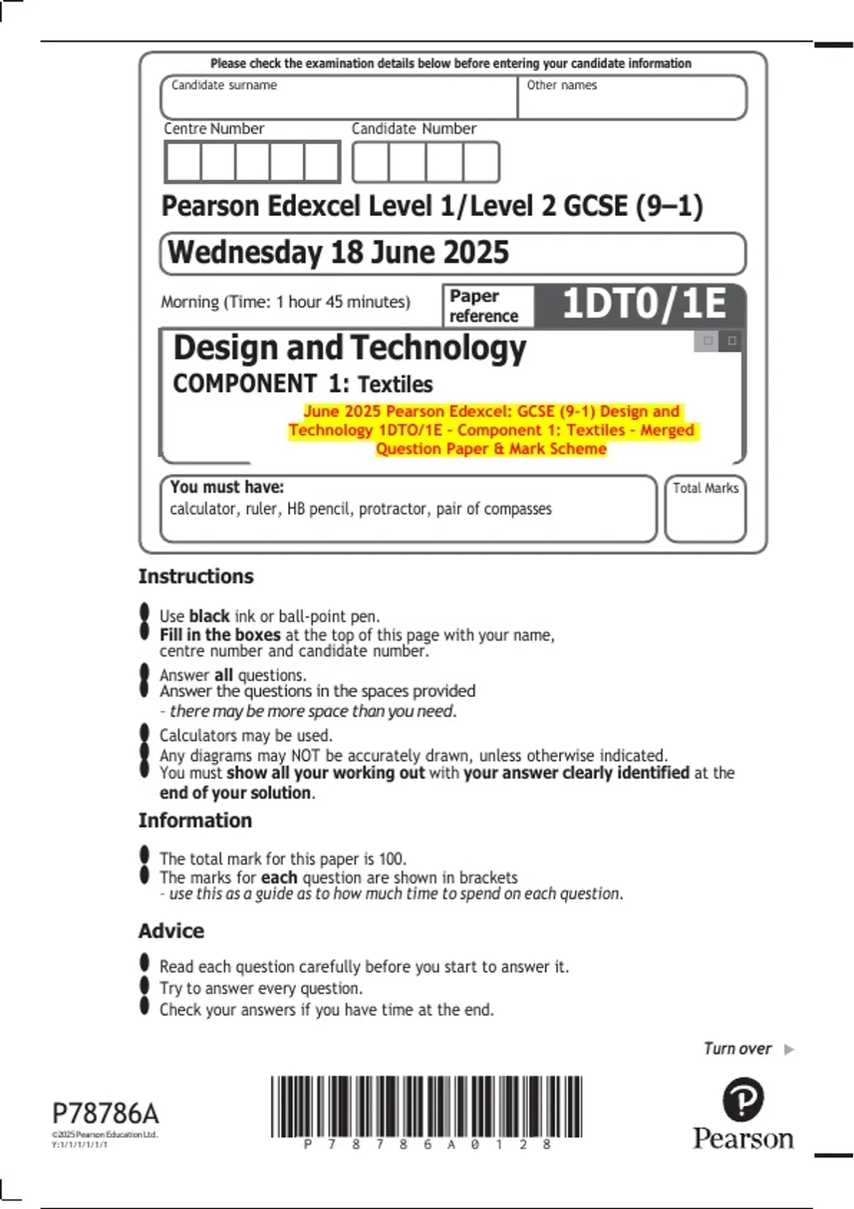 June 2025 Pearson Edexcel: GCSE (9–1) Design and Technology 1DTO/1E – Component 1: Textiles – Merged Question Paper & Mark Scheme