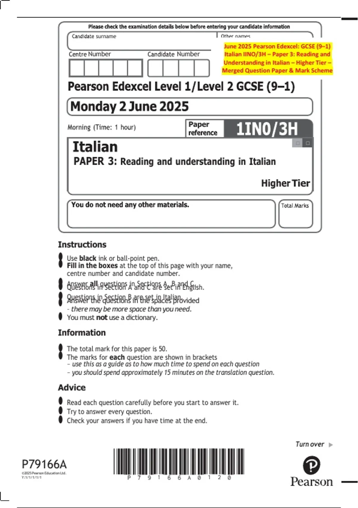 June 2025 Pearson Edexcel: GCSE (9–1) Italian IINO/3H – Paper 3: Reading and Understanding in Italian – Higher Tier – Merged Question Paper & Mark Scheme