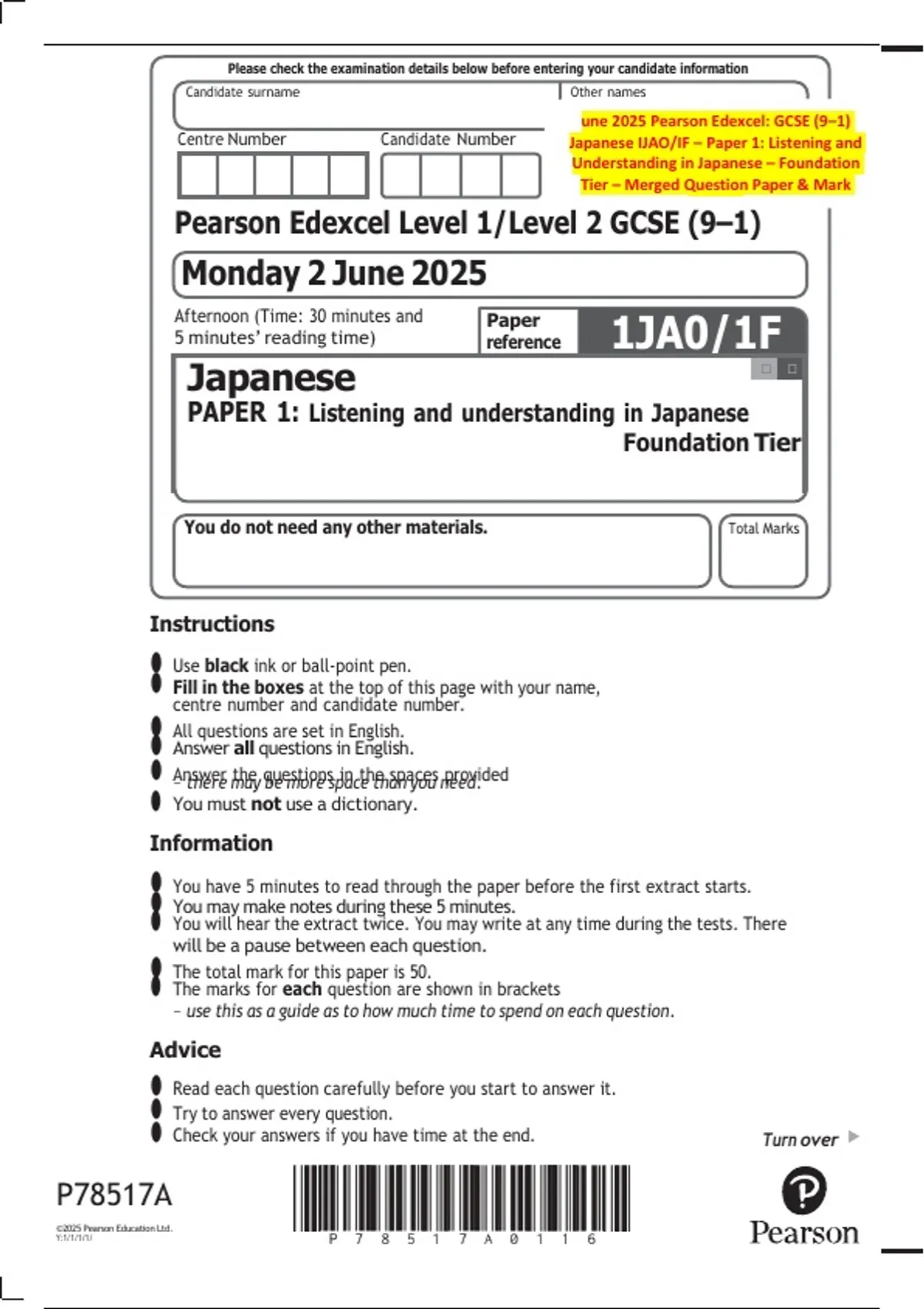 une 2025 Pearson Edexcel: GCSE (9–1)