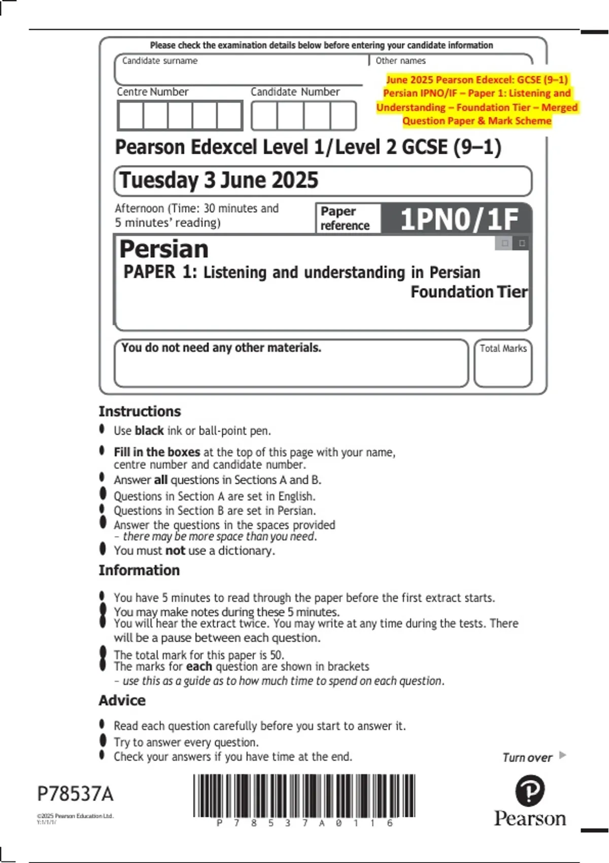 June 2025 Pearson Edexcel: GCSE (9–1) Persian IPNO/IF – Paper 1: Listening and Understanding – Foundation Tier – Merged Question Paper & Mark Scheme