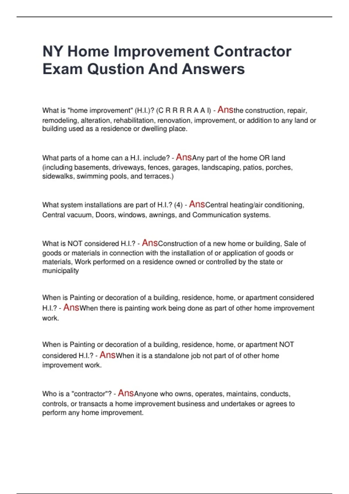 What is "home improvement" (H.I.)? (C R R R R A A I) - Ansthe construction, repair,