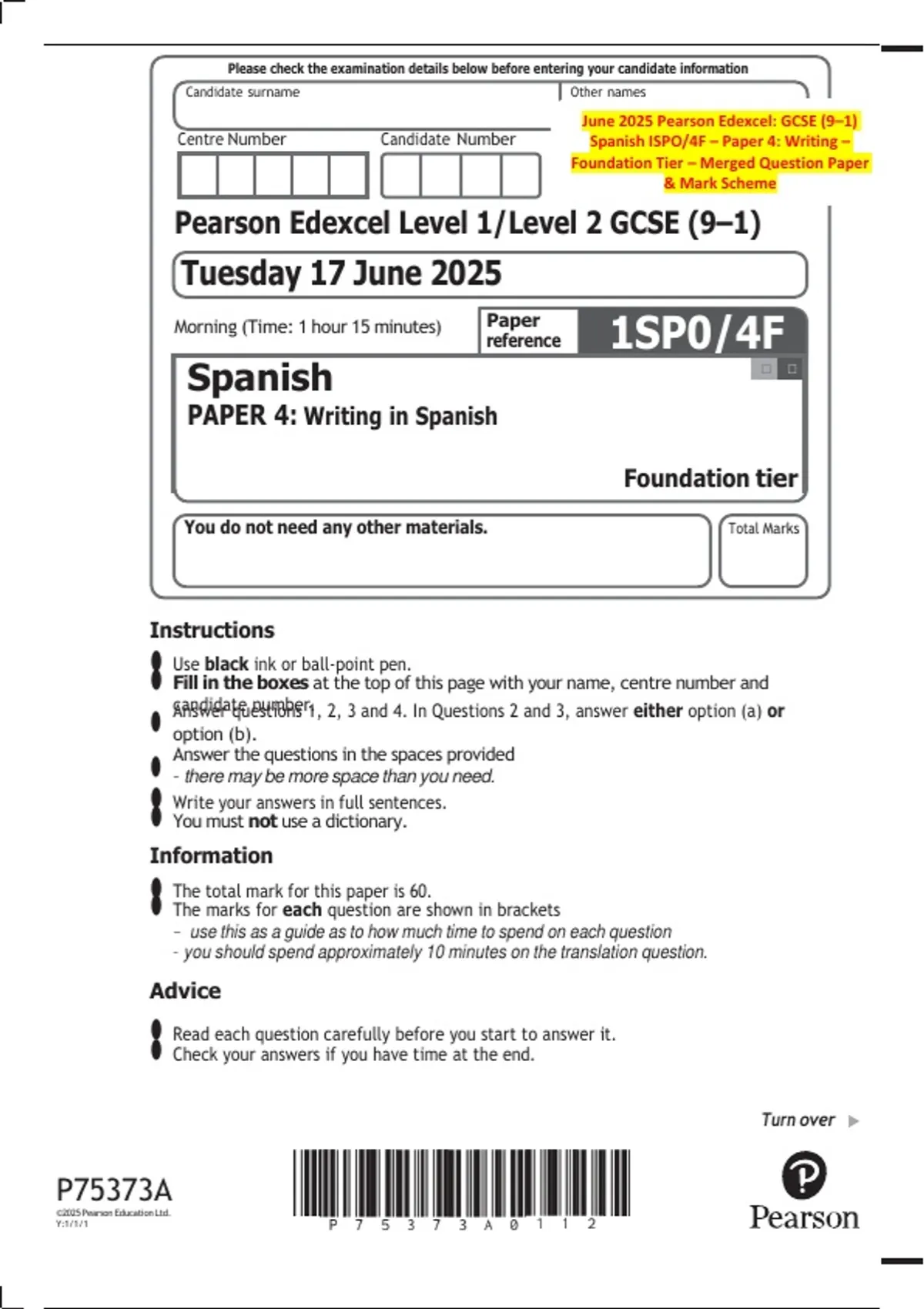 Centre Number Candidate Number Spanish ISPO/4F – Paper 4: Writing –
