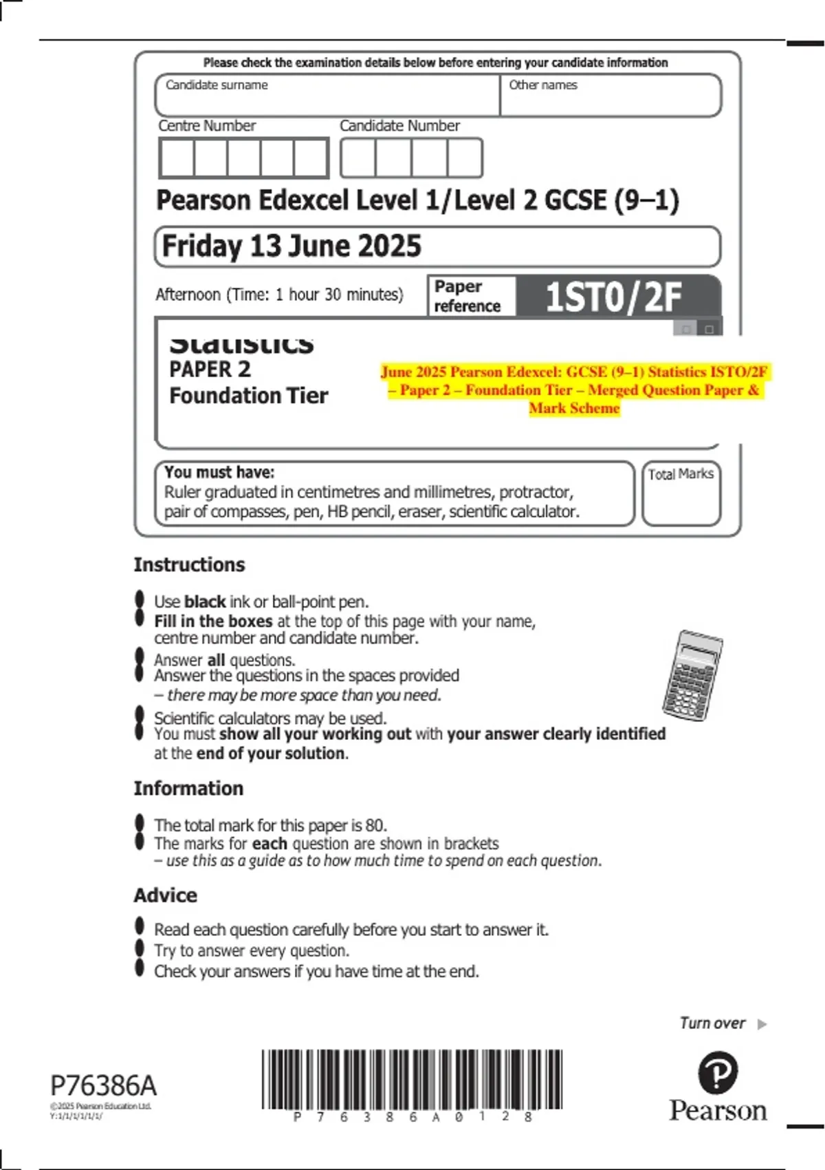 PAPER 2 June 2025 Pearson Edexcel: GCSE (9–1) Statistics ISTO/2F