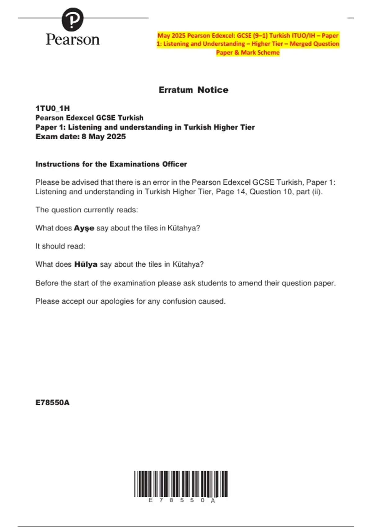 Please be advised that there is an error in the Pearson Edexcel GCSE Turkish, Paper 1: