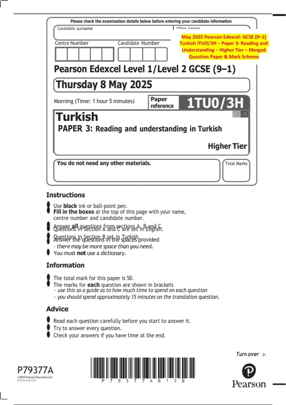 Centre Number Candidate Number Turkish ITUO/3H – Paper 3: Reading and