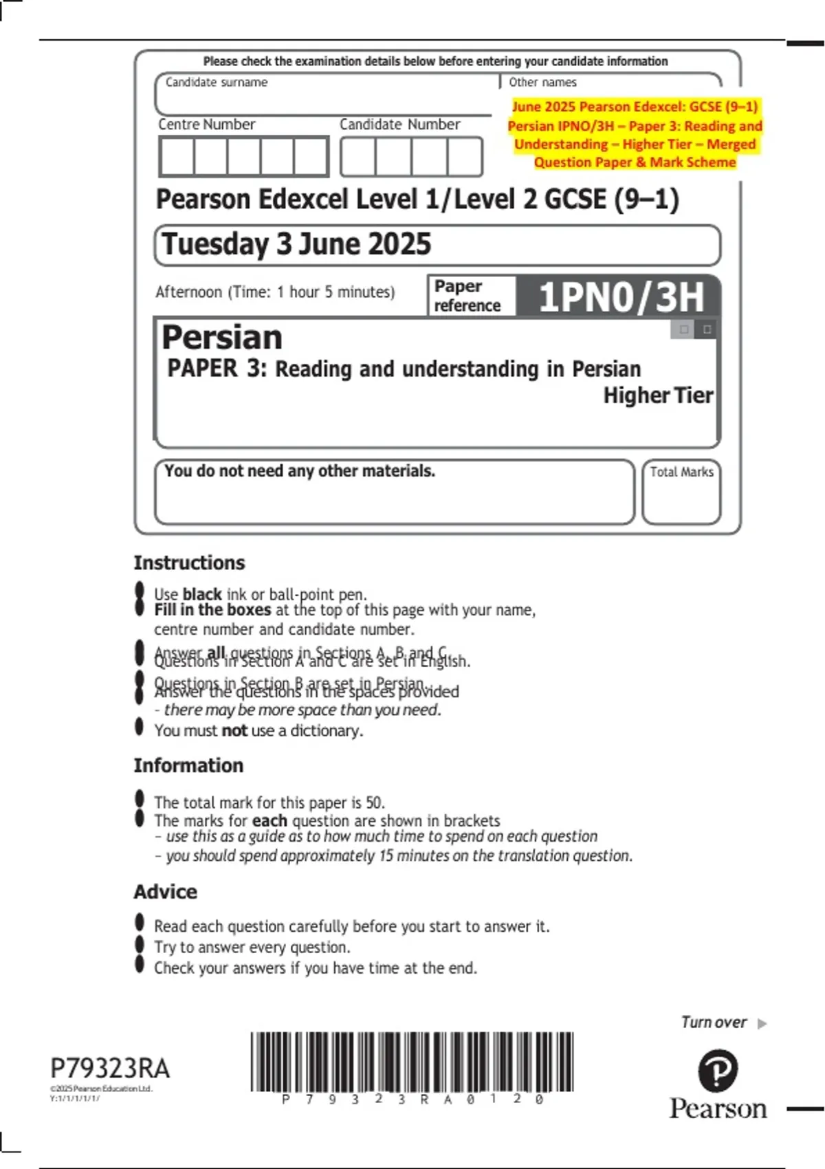 June 2025 Pearson Edexcel: GCSE (9–1) Persian IPNO/3H – Paper 3: Reading and Understanding – Higher Tier – Merged Question Paper & Mark Scheme