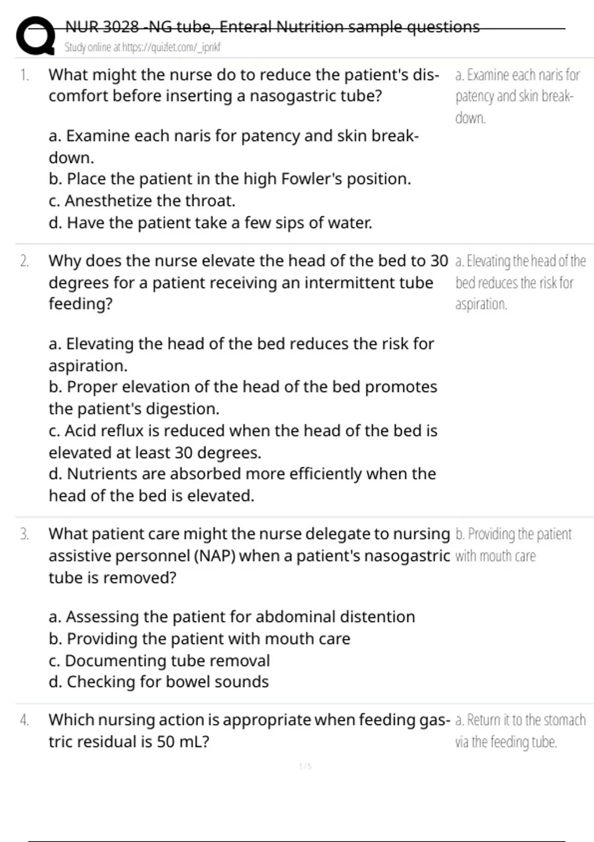 , NUR 3028 -NG tube, Enteral Nutrition sample questions