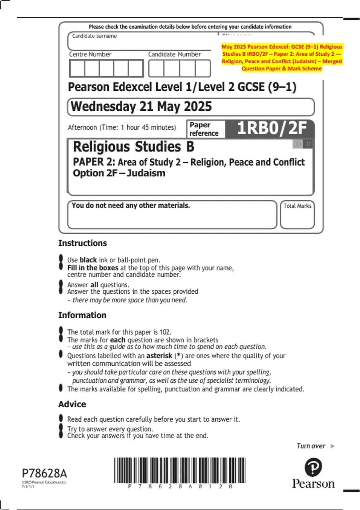 May 2025 Pearson Edexcel: GCSE (9–1) Religious Studies B IRBO/2F – Paper 2: Area of Study 2 — Religion, Peace and Conflict (Judaism) – Merged Question Paper & Mark Scheme
