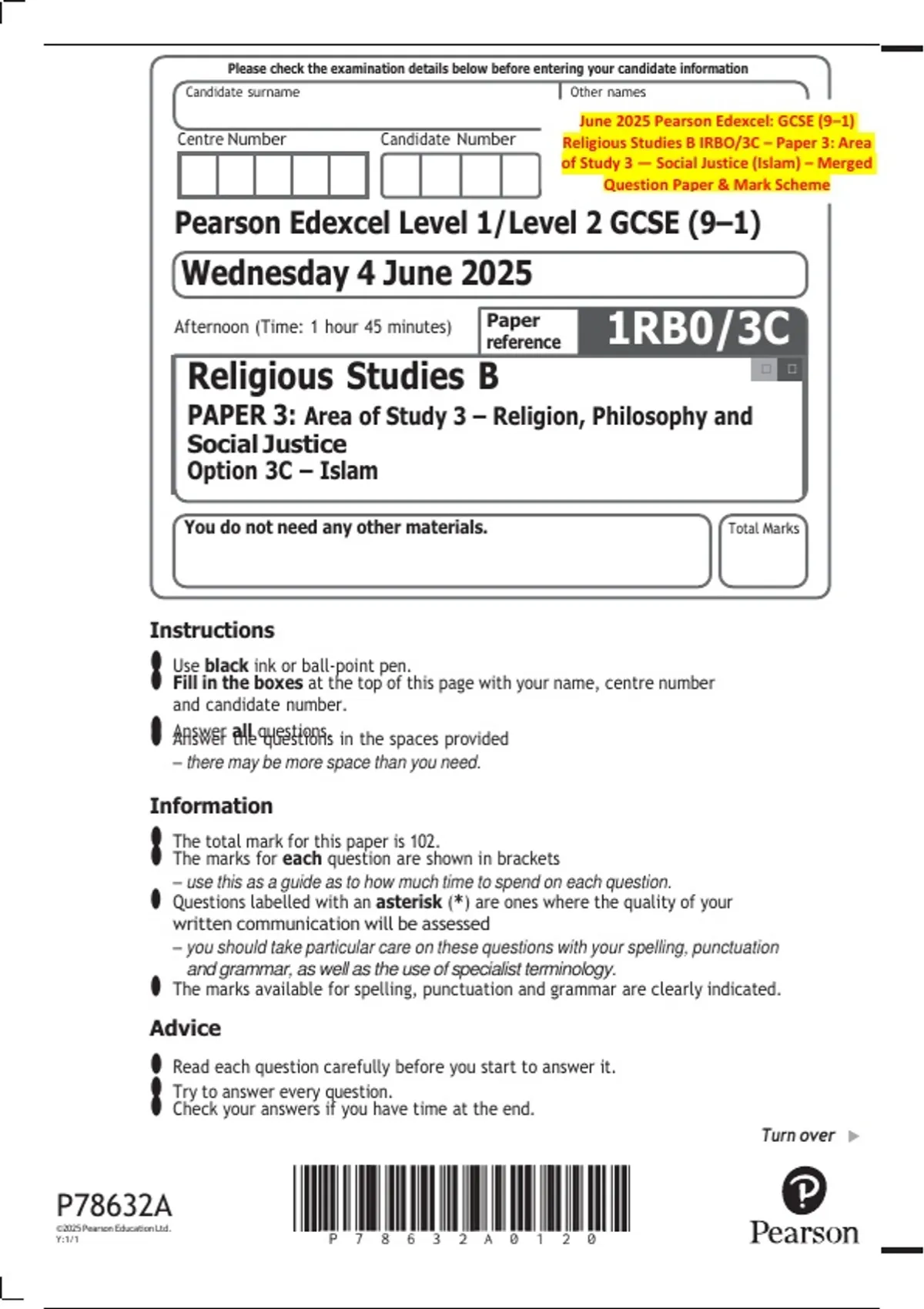 June 2025 Pearson Edexcel: GCSE (9–1) Religious Studies B IRBO/3C – Paper 3: Area of Study 3 — Social Justice (Islam) – Merged Question Paper & Mark Scheme