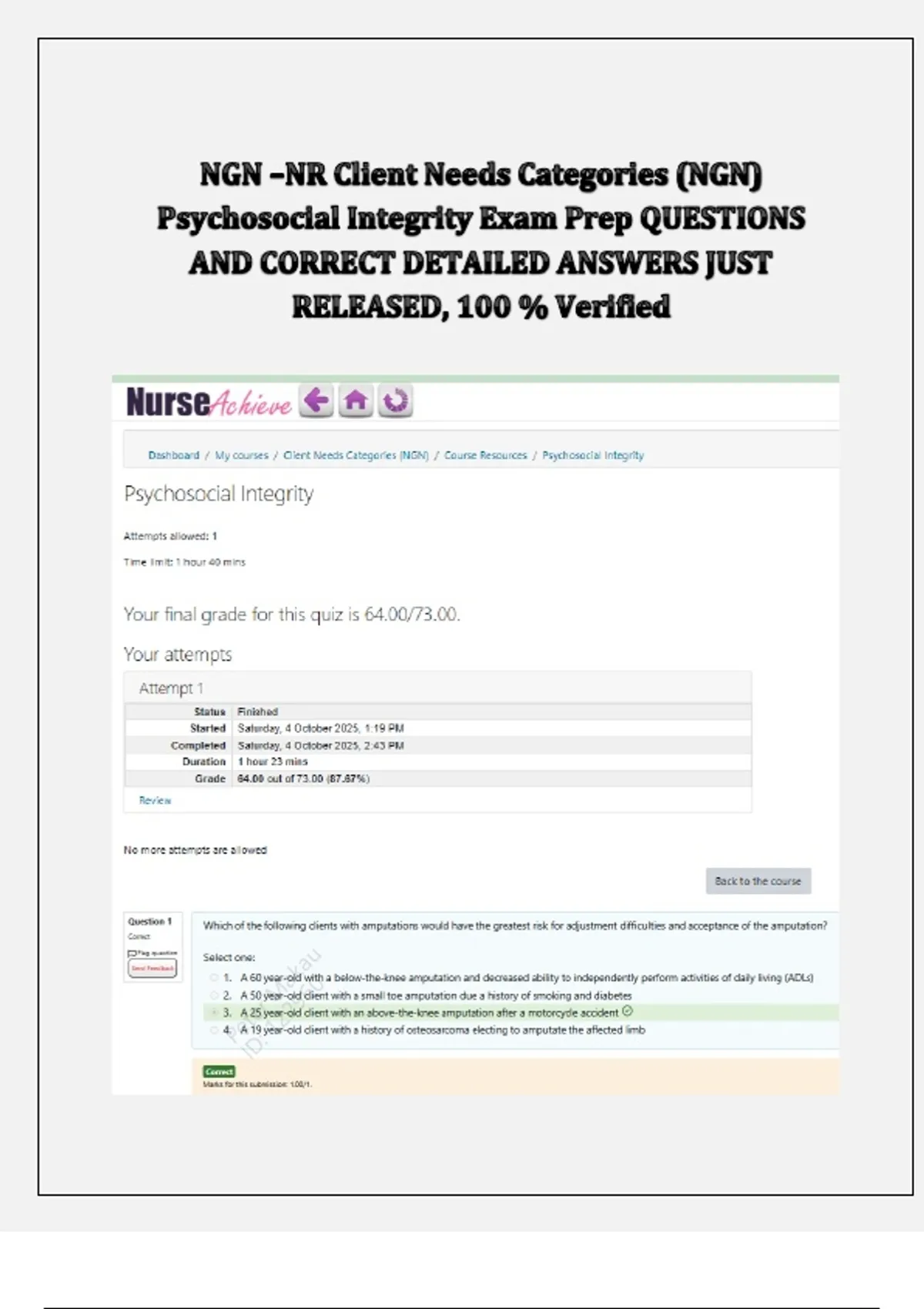 NGN –NR Client Needs Categories (NGN) Psychosocial Integrity Exam Prep QUESTIONS AND CORRECT DETAILED ANSWERS JUST RELEASED, 100 % Verified