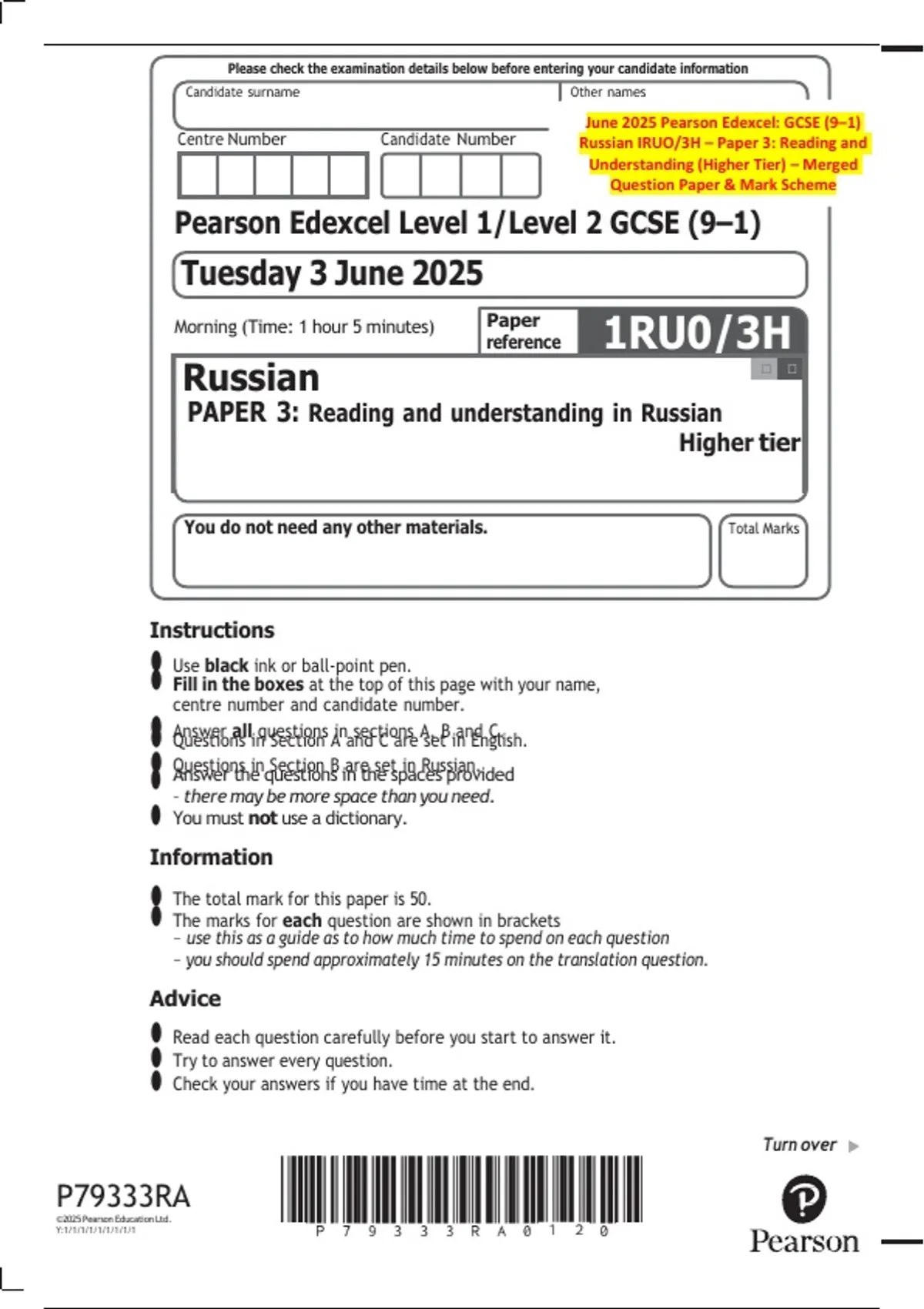 June 2025 Pearson Edexcel: GCSE (9–1) Russian IRUO/3H – Paper 3: Reading and Understanding (Higher Tier) – Merged Question Paper & Mark Scheme