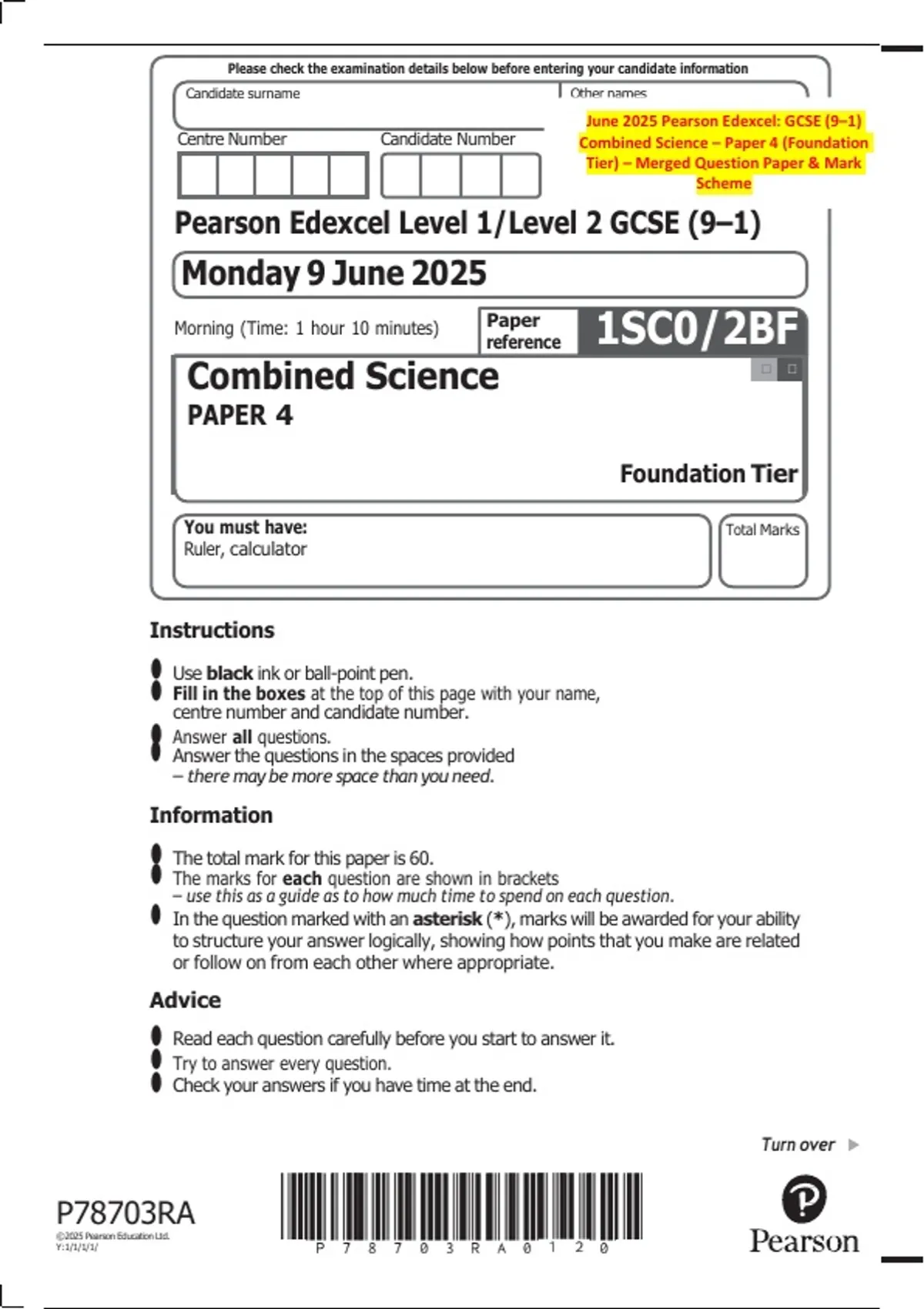 June 2025 Pearson Edexcel: GCSE (9–1) Combined Science – Paper 4 (Foundation Tier) – Merged Question Paper & Mark Scheme