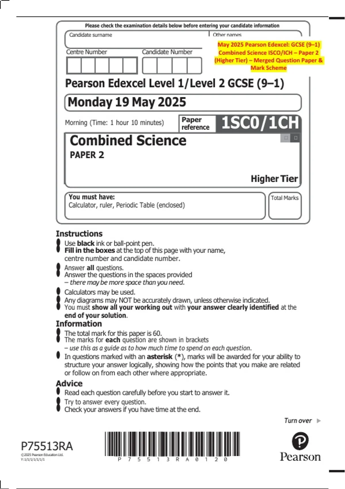 May 2025 Pearson Edexcel: GCSE (9–1) Combined Science ISCO/ICH – Paper 2 (Higher Tier) – Merged Question Paper & Mark Scheme