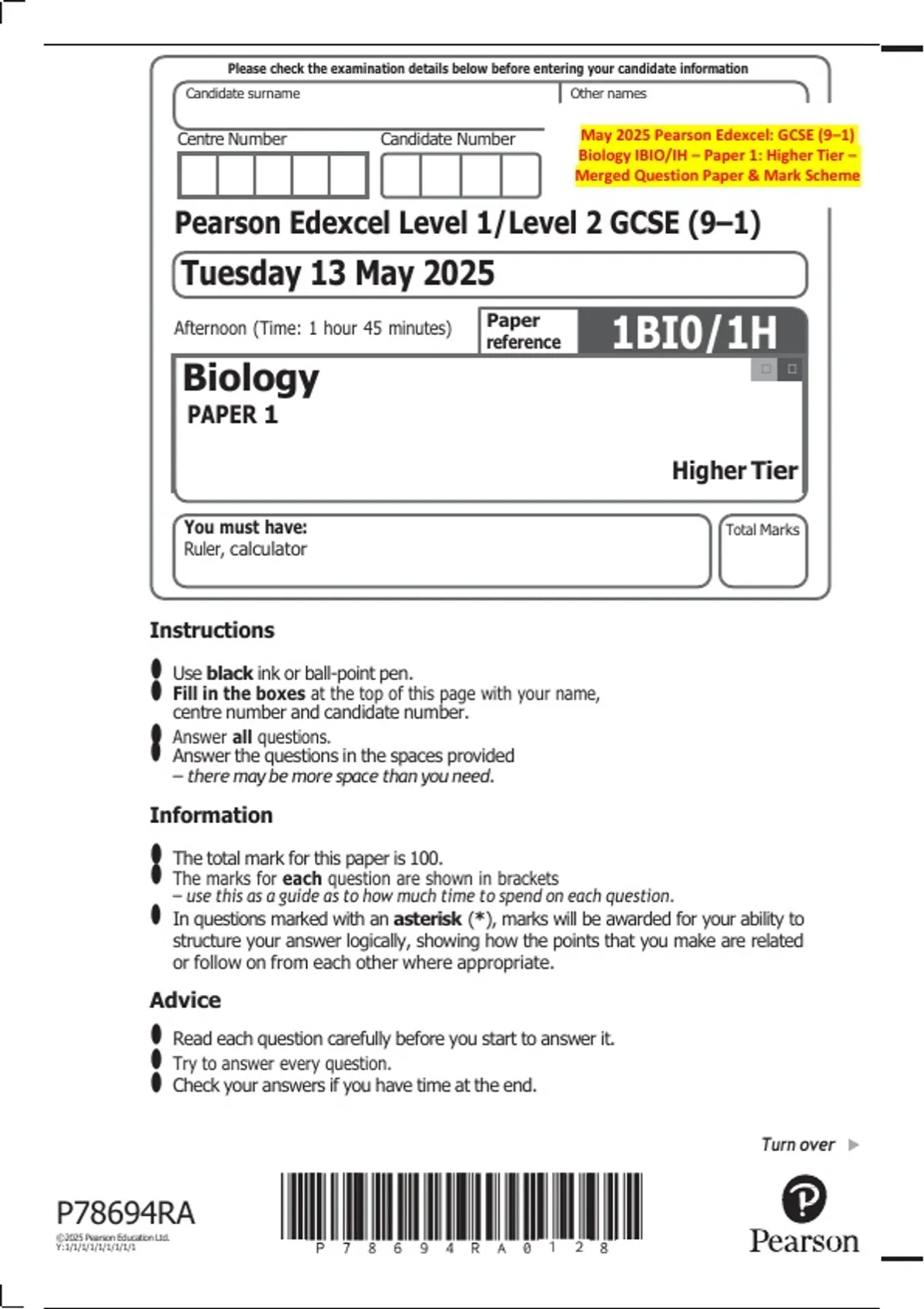 Biology IBIO/IH – Paper 1: Higher Tier –