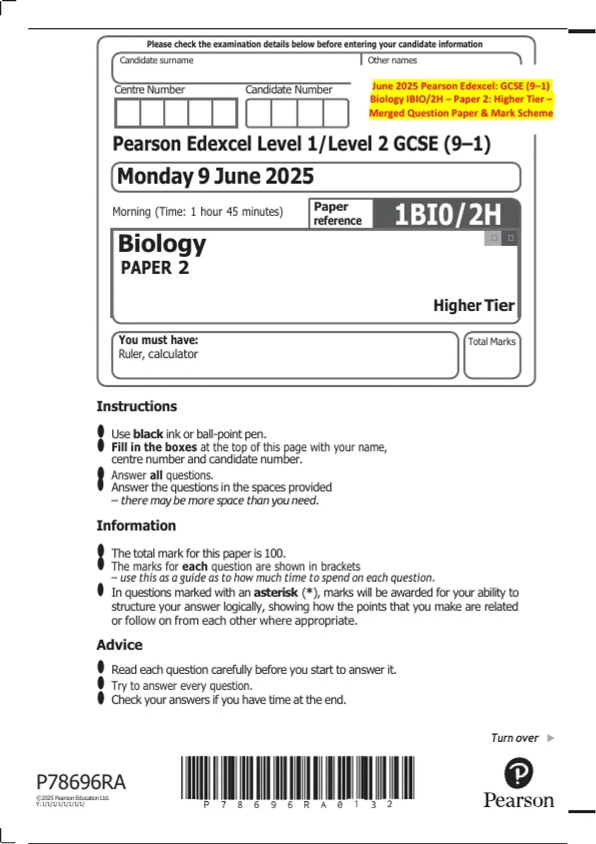 Centre Number Candidate Number June 2025 Pearson Edexcel: GCSE (9–1)