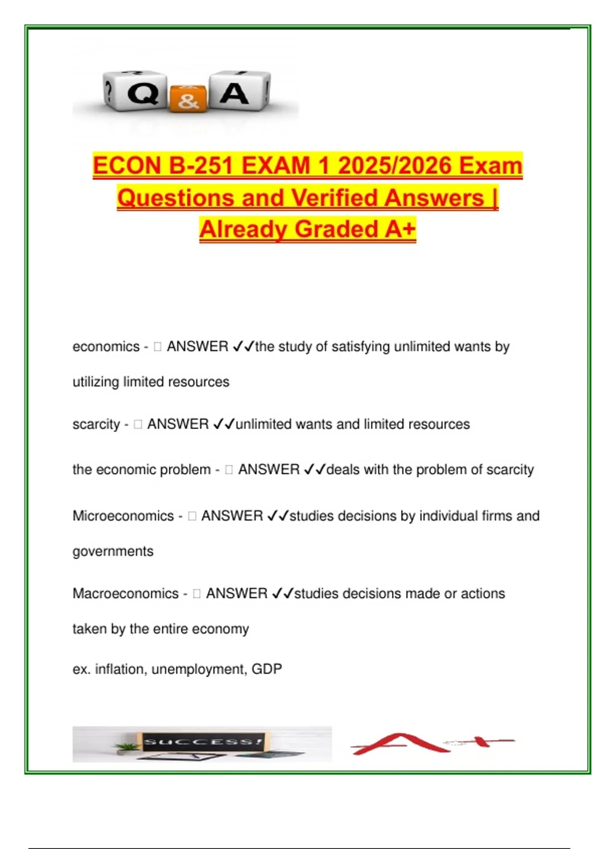 This document provides over 100 fully verified and graded questions with expert answers from the 2025/2026 Exam 1 for Econ B 251 – Principles of Microeconomics. It offers a deep and structured foundation for students pursuing economics and business programs at the university level, especially those in introductory microeconomics courses. Key topics covered include the fundamentals of economics, such as scarcity, rational choice, and opportunity cost, along with essential microeconomic models like marginal analysis, production possibilities curves (PPCs), and comparative vs. absolute advantage. The guide also covers detailed insights on market structure, price mechanisms, elasticity of demand and supply, income and cross-price elasticity, and consumer behavior under constraints. Students are guided through real-world applications of equilibrium analysis, shifts in supply and demand, and various elasticity scenarios, with emphasis on revenue outcomes, efficiency, and trade-offs. Definitions, examples, and problem-solving strategies are clearly presented in Q&A format, making this a complete exam preparation toolkit. This resource is ideal for students in: – Principles of Microeconomics (Econ B 251 or equivalent) – Business, Finance, and Public Policy foundations – AP Microeconomics or CLEP Economics Exam Prep – Introductory Economics for Political Science or Law students Keywords: microeconomics, scarcity, opportunity cost, supply and demand, elasticity, marginal analysis, PPC, comparative advantage, absolute advantage, consumer behavior, economic models, price equilibrium, normal goods, inferior goods, market efficiency, rationality assumption, income effect, substitution effect, production efficiency, allocative efficiency, total revenue, price floors, price ceilings