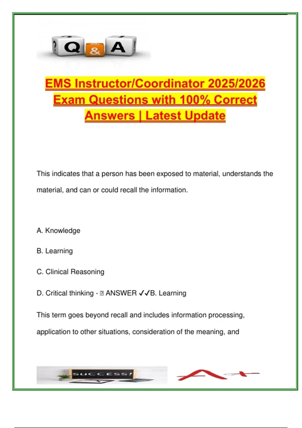 D. Critical Thinking - 🧠 ANSWER ✔✔A. Knowledge