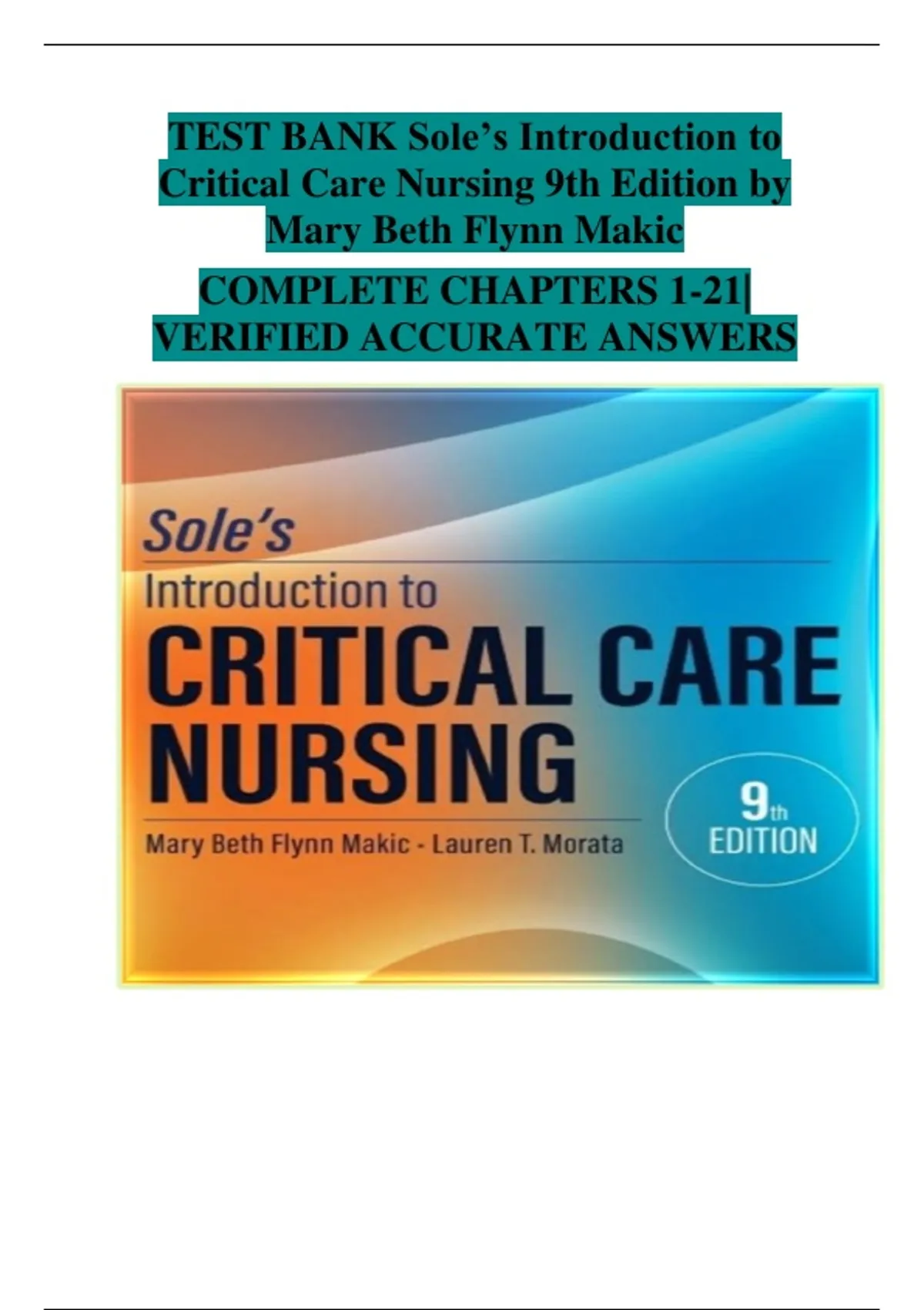 This complete test bank accompanies Sole’s Introduction to Critical Care Nursing (9th Edition) by Mary Beth Flynn Makic. It includes comprehensive multiple-choice and multiple-response questions with verified correct answers and rationales, covering all 21 chapters of the textbook. Topics include professional standards, ethical and legal issues, patient and family response to critical illness, safety and quality initiatives, and evidence-based critical care practices. Ideal for nursing students preparing for exams and NCLEX-style assessments, as well as instructors creating quizzes and practice tests.