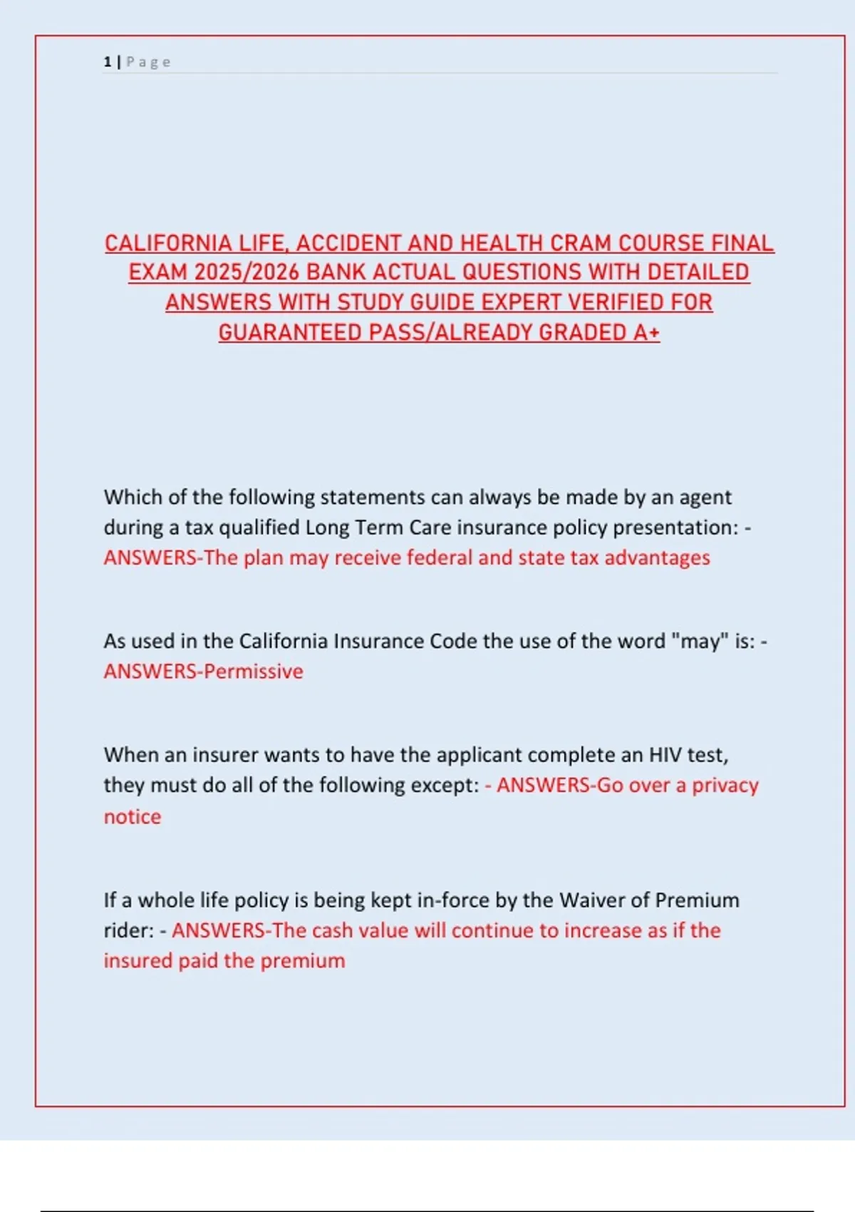 CALIFORNIA LIFE, ACCIDENT AND HEALTH CRAM COURSE FINAL EXAM 2025/2026 BANK ACTUAL QUESTIONS WITH DETAILED ANSWERS WITH STUDY GUIDE EXPERT VERIFIED FOR GUARANTEED PASS/ALREADY GRADED A+