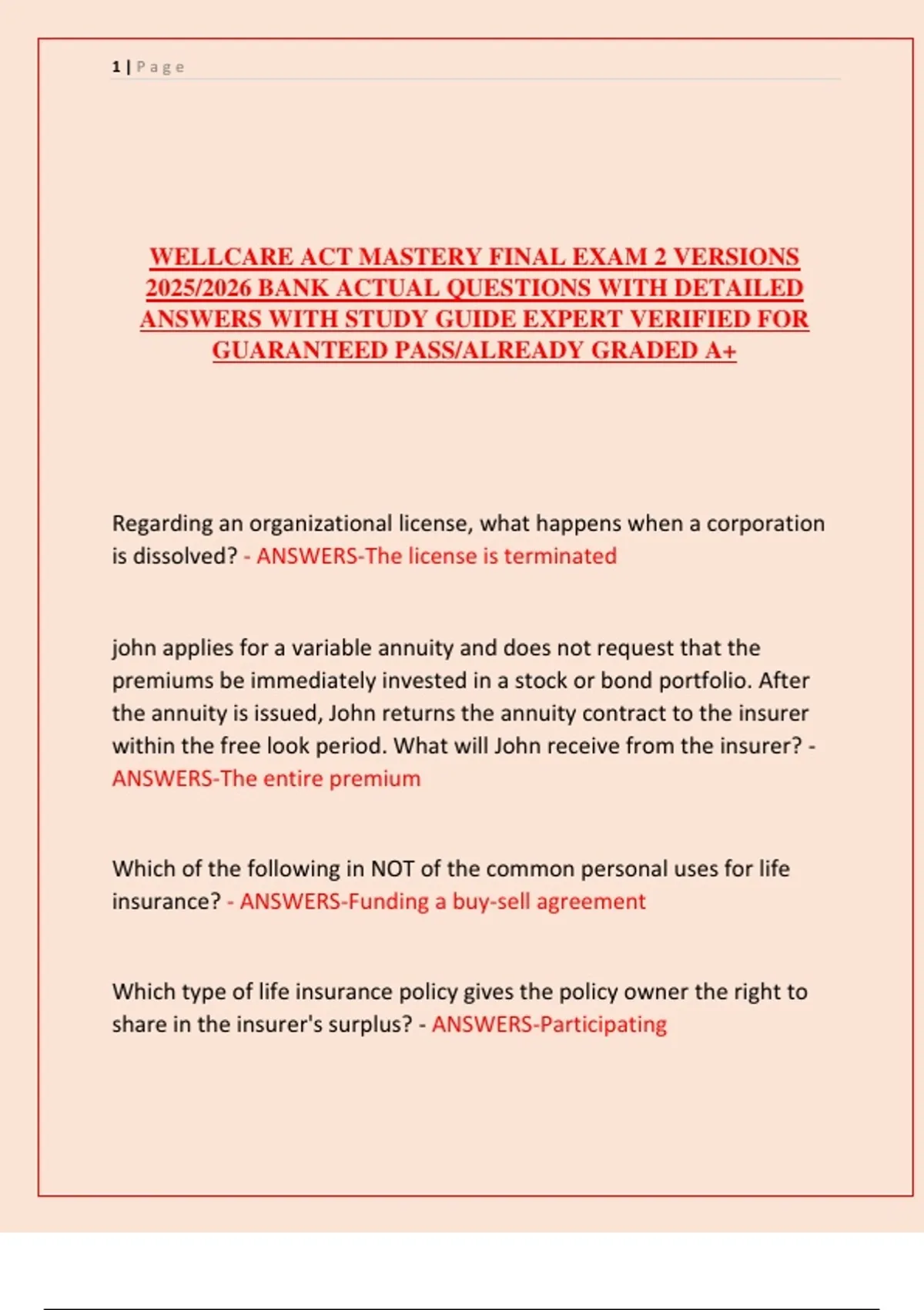 WELLCARE ACT MASTERY FINAL EXAM 2 VERSIONS