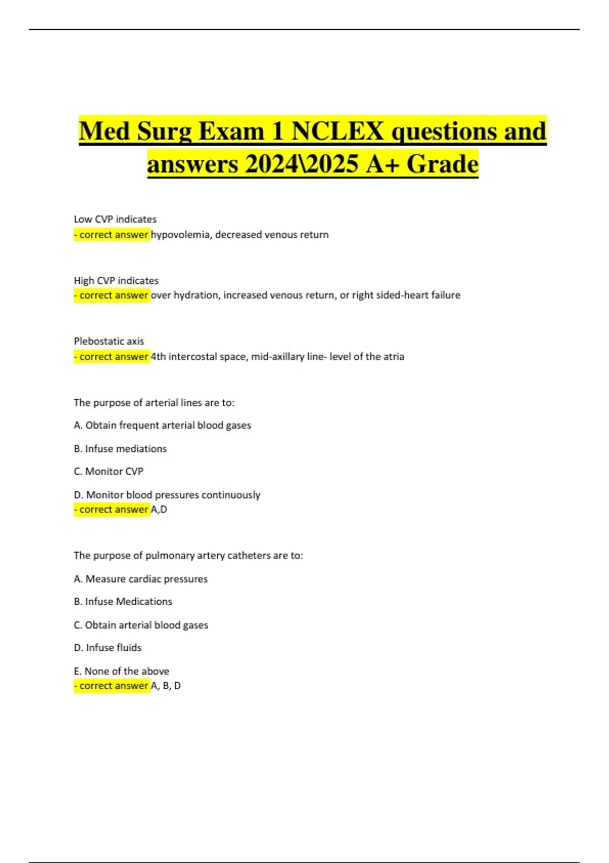 Medical-Surgical Nursing Exam 1 – NCLEX Practice Questions and Correct Answers – 100% Verified and Updated for Guaranteed Success: This file contains the most recent collection of Medical-Surgical Nursing Exam 1 NCLEX-style questions with verified correct answers. It covers key nursing areas such as cardiovascular, respiratory, endocrine, renal, and neurological systems, along with fluid and electrolyte balance, safety, and patient care management. Designed to mirror actual NCLEX exam standards, this updated material helps reinforce critical thinking and test readiness.