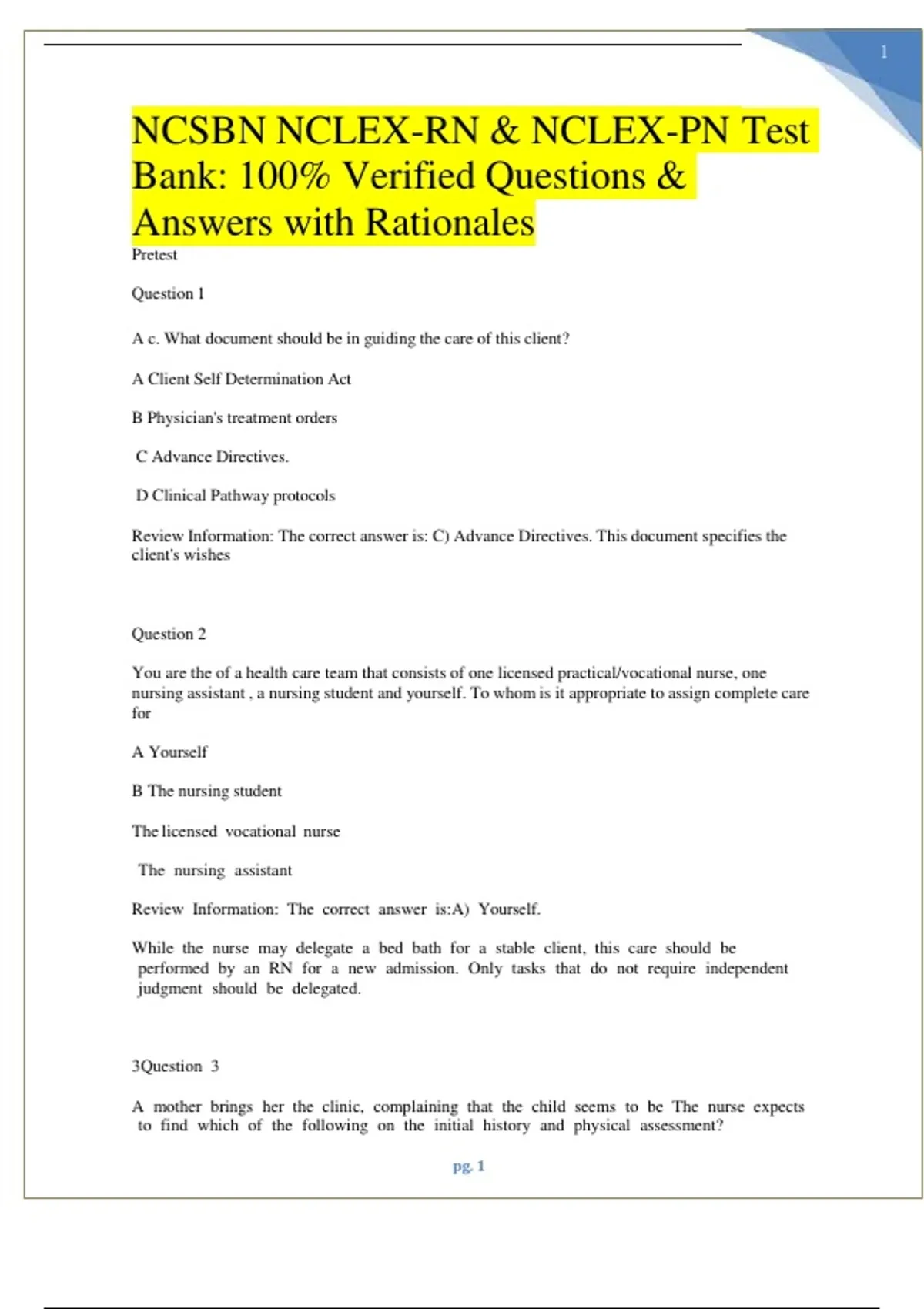 Boost your exam readiness with the NCSBN NCLEX-RN & NCLEX-PN Test Bank 2025, featuring 100% verified questions, correct answers, and detailed rationales. This comprehensive resource follows the official NCSBN exam framework, covering all key nursing topics including pharmacology, patient care, safety, and clinical reasoning. Designed for nursing students in the United States, this guide ensures you understand the “why” behind every answer—helping you think like a nurse and pass on your first attempt. Download now to study smarter and achieve excellence on your NCLEX-RN and NCLEX-PN exams!
