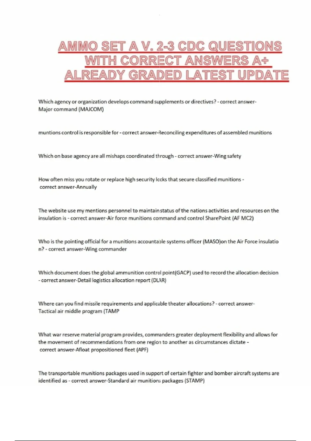 AMMO SET A V. 2-3 CDC QUESTIONS WITH CORRECT ANSWERS A+ ALREADY GRADED LATEST UPDATE Which agency or organization develops command supplements or directives? - correct answer- Major command (MAJCOM) muntions control is responsible for - correct answer-Reconciling expenditures of assembled munitions Which on base agency are all mishaps coordinated through - correct answer-Wing safety How often miss you rotate or replace high security locks that secure classified munitions - correct answer-Annually